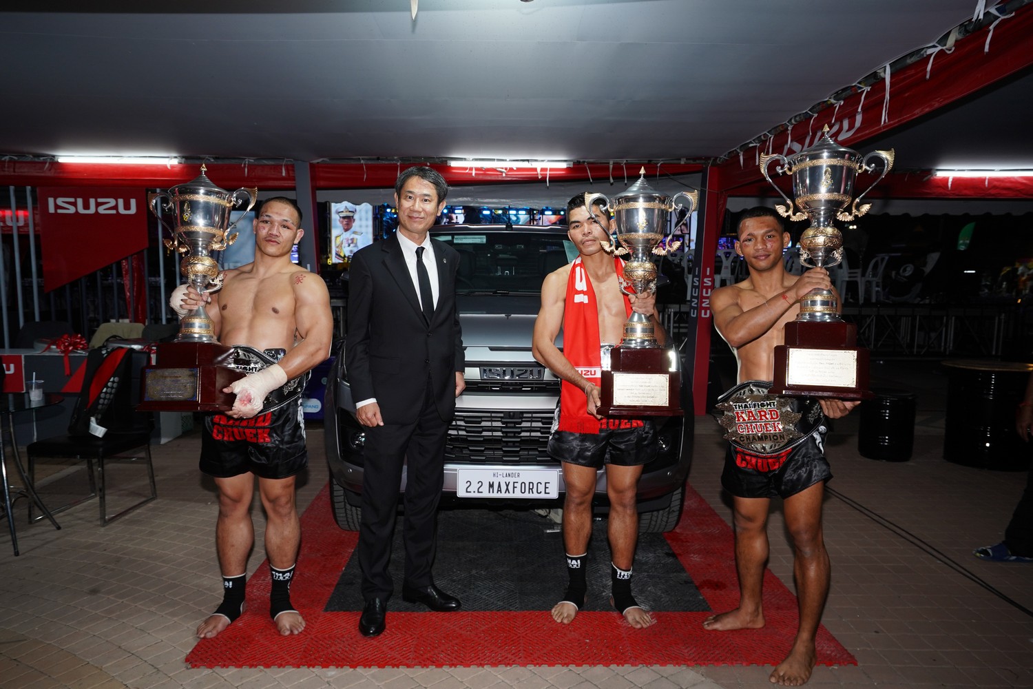 มร. ทาคาชิ ฮาตะ กรรมการผู้จัดการ บริษัท ตรีเพชรอีซูซุเซลส์ จำกัด กล่าวว่า “ขอแสดงความยินดีกับ จรวดศึก และ เขี้ยวเพชร ที่คว้าแชมป์ THAI FIGHT 2025 มาครองได้อย่างสง่างาม ด้วยหัวใจนักสู้ที่แข็งแกร่งจนได้รับพระราชทานถ้วยรางวัลอันทรงเกียรติ ซึ่งถือเป็นความสำเร็จอันน่าภาคภูมิใจในอาชีพนักชก ผมขออวยพรให้ทั้งสองท่านประสบความสำเร็จยิ่งขึ้นไปในอนาคต พร้อมกันนี้ ขอขอบคุณผู้ชมทุกท่านที่ให้การสนับสนุนรถอีซูซุ รายการ Isuzu Thailand Championship และ THAI FIGHT ด้วยดีเสมอมา ทุกแรงใจของท่านคือพลังสำคัญที่ขับเคลื่อนให้อีซูซุมุ่งมั่นพัฒนาอย่างไม่หยุดยั้ง และเราหวังเป็นอย่างยิ่งว่าจะได้รับความไว้วางใจจากทุกท่านเช่นนี้ตลอดไป”