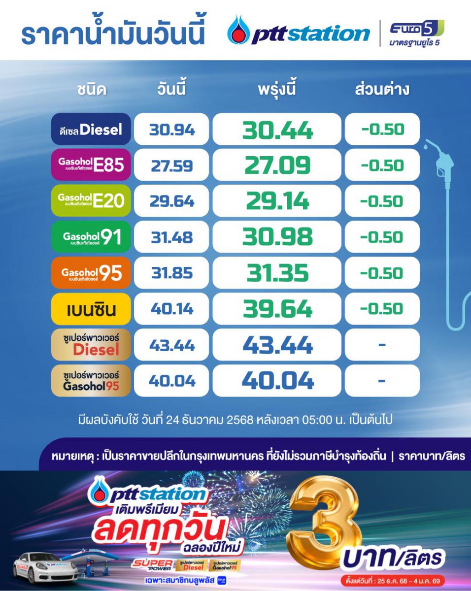 ม.ล. ปีกทอง ทองใหญ่ ประธานเจ้าหน้าที่บริหาร บริษัท ปตท. น้ำมันและการค้าปลีก จำกัด (มหาชน) หรือ OR เปิดเผยว่า สถานีบริการ พีทีที สเตชั่น ปรับลดราคาน้ำมัน เกรดมาตรฐานทุกชนิด 50 สตางค์/ลิตร ตั้งแต่วันที่ 24 ธ.ค. 68 เป็นต้นไป พร้อมจัดโปรโมชันพิเศษส่งท้ายปี ด้วยการลดราคาน้ำมัน เกรดพรีเมียม สูงสุด 3 บาท/ลิตร ตั้งแต่วันที่ 25 ธ.ค. 68 - 4 ม.ค. 69 ณ พีทีที สเตชั่น ทั่วประเทศที่ร่วมรายการ นอกจากนี้ จะไม่ปรับขึ้นราคาน้ำมันเป็นเวลา 7 วัน ระหว่างวันที่ 30 ธ.ค. 68 – 5 ม.ค. 69 ถึงแม้ราคาน้ำมันในตลาดโลกจะปรับตัวสูงขึ้น และหากราคาน้ำมันในตลาดโลกปรับตัวลดลง OR ก็จะปรับราคาน้ำมันลงด้วย และ OR ยังได้เตรียมความพร้อมเพื่อรองรับการเดินทางท่องเที่ยว และการเดินทางกลับภูมิลำเนา โดยได้สำรองน้ำมันเชื้อเพลิงทั้งที่สถานีบริการ พีทีที สเตชั่น และคลังน้ำมันของ OR ทั่วประเทศให้เพียงพอ และ พร้อมทั้งจัดเตรียมให้ พีทีที สเตชั่น เป็นจุดแวะพักที่จะช่วยเติมเต็มความสุขให้ทั้งผู้คน สังคม และชุมชน ตลอดช่วงเทศกาลปีใหม่นี้