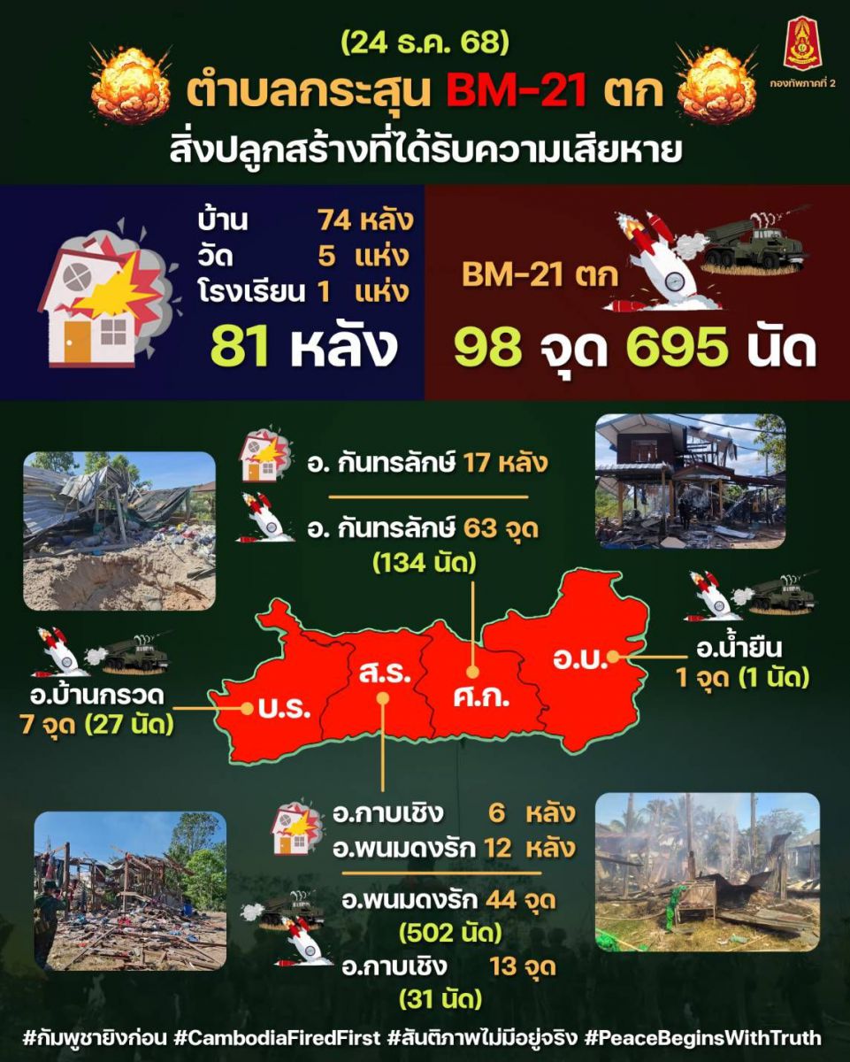 ภาพความเสียหายจากการถูกยิงด้วยจรวดหลายลำกล้อง(BM-21) พื้นที่กว้างลงสู่ชุมชน บ้าน วัด และโรงเรียน คือ หลักฐานที่ไม่อาจปฏิเสธได้ว่า การทำสงครามโดยไม่แยกแยะเป้าหมายและไม่คุ้มครองพลเรือน คือ การละเมิดหลักกฎหมายมนุษยธรรมระหว่างประเทศอย่างชัดแจ้ง การอ้าง “ สันติภาพ ” เพื่อสร้างความชอบธรรมให้การใช้กำลังที่ทำลายชีวิตและทรัพย์สินของประชาชน เป็นเพียงวาทกรรมที่บิดเบือนความจริง