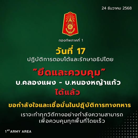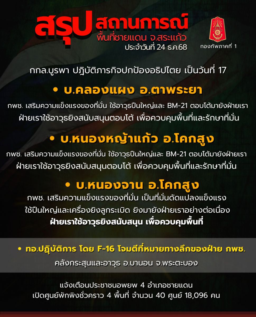 ศูนย์ปฏิบัติการกองทัพภาคที่ 1 สรุปสถานการณ์ชายแดนไทย-กัมพูชา พื้นที่ จ.สระแก้วประจำวัน 24 ธันวาคม 2568 เวลา 18.00 น.
