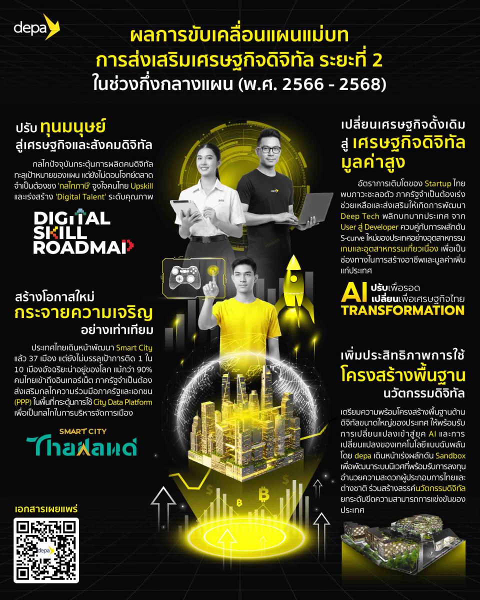นางสาวกษมา กองสมัคร รักษาการรองผู้อำนวยการใหญ่ กลุ่มงานยุทธศาสตร์และความมั่นคง สำนักงานส่งเสริมเศรษฐกิจดิจิทัล หรือ ดีป้า เปิดเผยว่า ผลการประเมินความก้าวหน้าการขับเคลื่อนแผนแม่บทการส่งเสริมเศรษฐกิจดิจิทัล ระยะที่ 2 (พ.ศ. 2566 – 2570) ในช่วงกึ่งกลางแผนที่ดำเนินการร่วมกับมูลนิธิสถาบันวิจัยนโยบายเศรษฐกิจการคลัง ได้ยืนยันถึงความจำเป็นที่ต้องมีการปรับปรุงแผนการขับเคลื่อนเศรษฐกิจและสังคมดิจิทัลให้สามารถบรรลุเป้าหมายได้ โดยเฉพาะในเชิงคุณภาพ ท่ามกลางยุคที่เทคโนโลยีถูกพัฒนาและเปลี่ยนแปลงอย่างรวดเร็ว โดยได้เสนอแนะทิศทางการขับเคลื่อนตาม 4 ยุทธศาสตร์สำคัญ ดังนี้