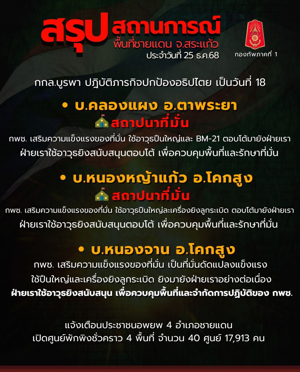ศูนย์ปฏิบัติการกองทัพภาคที่ 1 สรุปสถานการณ์ชายแดนไทย-กัมพูชา พื้นที่ จ.สระแก้วประจำวัน 25 ธันวาคม 2568 เวลา 18.00 น.