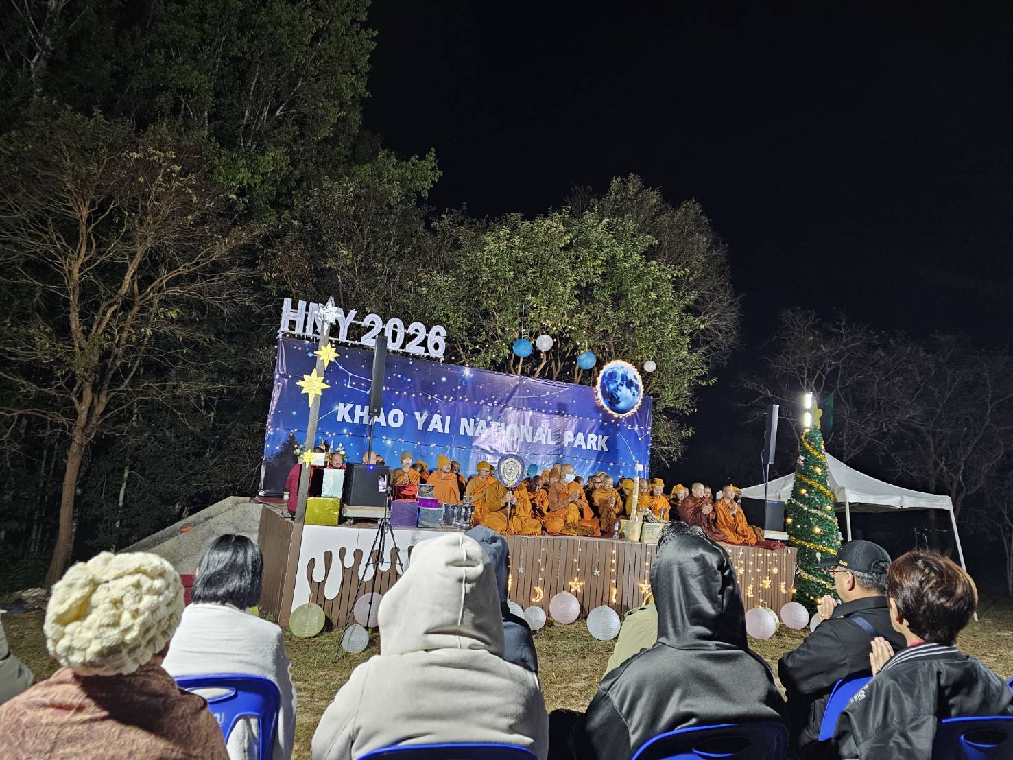 จนเวลา 23.30 น.นายชัยยา ห้วยหงษ์ทอง หัวหน้าอุทยานแห่งชาติเขาใหญ่ เป็นประธานจุดเทียนธูปบูชาพระรัตนตรัย กล่าวอาราธนาศีล พิธีกรนำอาราธนาพระปริตร พระสงฆ์ รวมจำนวน 72 รูป เจริญพุทธมนต์เพื่อเป็นสิริมงคลข้ามปี ท่ามกลางนักท่องเที่ยว ร่วมสวดมนต์ข้ามปี จนเข้าสู่ปีพุทธศักราชใหม่ 2569 เสร็จพิธี