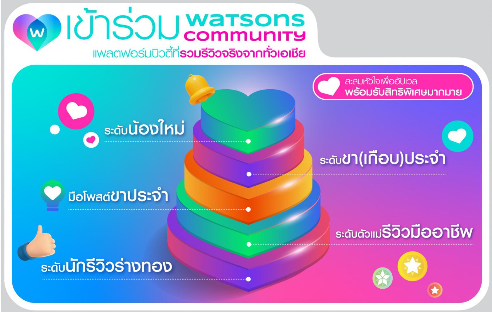 ·ร่วมแบ่งปัน Watsons Community มันคือ พื้นที่สร้างสรรค์สำหรับทุกคน เริ่มต้นสร้างโปรไฟล์ของคุณ เพื่อรีวิวสินค้าที่ชื่นชอบ ถามข้อสงสัยเกี่ยวกับบิวตี้ไอเทม หรือแชร์ทริคการดูแลตัวเอง พร้อมสะสมคะแนนและเลื่อนระดับสู่การเป็นที่สุดของนักรีวิวร่างทอง เพื่อแลกรับของรางวัลมากมาย อาทิ สกินแคร์ & บิวตี้ไอเท็มมากมายจากแบรนด์ชั้นนำ