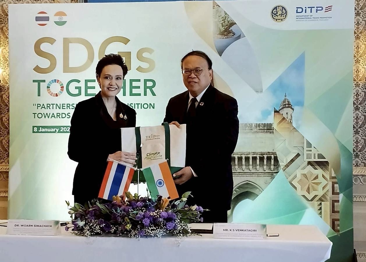 ณ เมืองมุมไบ สาธารณรัฐอินเดีย-สถาบันสิ่งแวดล้อมไทย (TEI) เดินหน้าผลักดันสินค้าและบริการที่เป็นมิตรต่อสิ่งแวดล้อมของไทยสู่ตลาดอินเดียร่วมกับกระทรวงพาณิชย์ ผ่านการลงนามความตกลงการยอมรับร่วม (Mutual Recognition Agreement: MRA) ระหว่าง Confederation of Indian Industry’s Sohrabji Godrej Green Business Centre (CII–GBC) และสถาบันสิ่งแวดล้อมไทย (Thailand Environment Institute: TEI) โดยมี Mr. K. S. Venkatagiri Executive Director of CII–GBC และ ดร.วิจารย์ สิมาฉายา ผู้อำนวยการสถาบันสิ่งแวดล้อมไทย เป็นผู้ลงนาม ภายใต้นโยบาย SDG Together สร้างความร่วมมือไทย–อินเดียในห่วงโซ่อุปทานภาคการก่อสร้างและอสังหาริมทรัพย์ ผลักดันการยอมรับมาตรฐานสินค้าฉลากเขียวระหว่างกัน โดยมีนางศุภจี สุธรรมพันธ์ุรัฐมนตรีว่าการกระทรวงพาณิชย์ เป็นสักขีพยาน