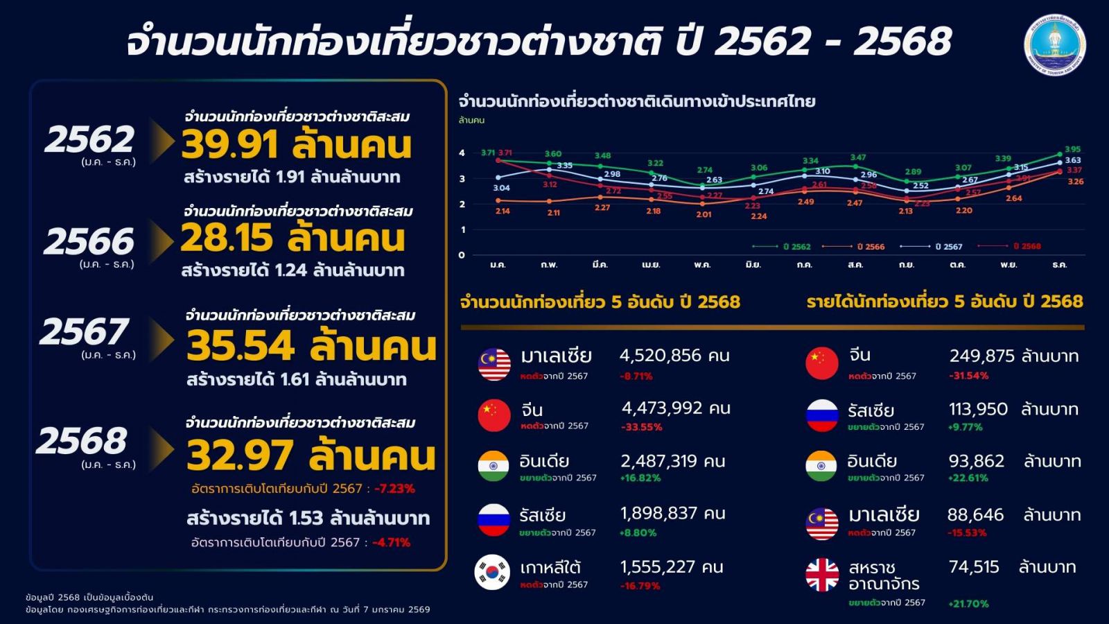 ตั้งแต่วันที่ 1 มกราคม - 31 ธันวาคม 2568 #มีนักท่องเที่ยวชาวต่างชาติเดินทางมาท่องเที่ยวประเทศไทยจำนวน 32.97 ล้านคน หดตัวร้อยละ 7.23 เมื่อเปรียบเทียบกับช่วงเวลาเดียวกันของปีที่ผ่านมา #สร้างรายได้ 1.53 แสนล้านบาท หดตัวร้อยละ 4.71 เมื่อเปรียบเทียบกับช่วงเวลาเดียวกันของปีที่ผ่านมา