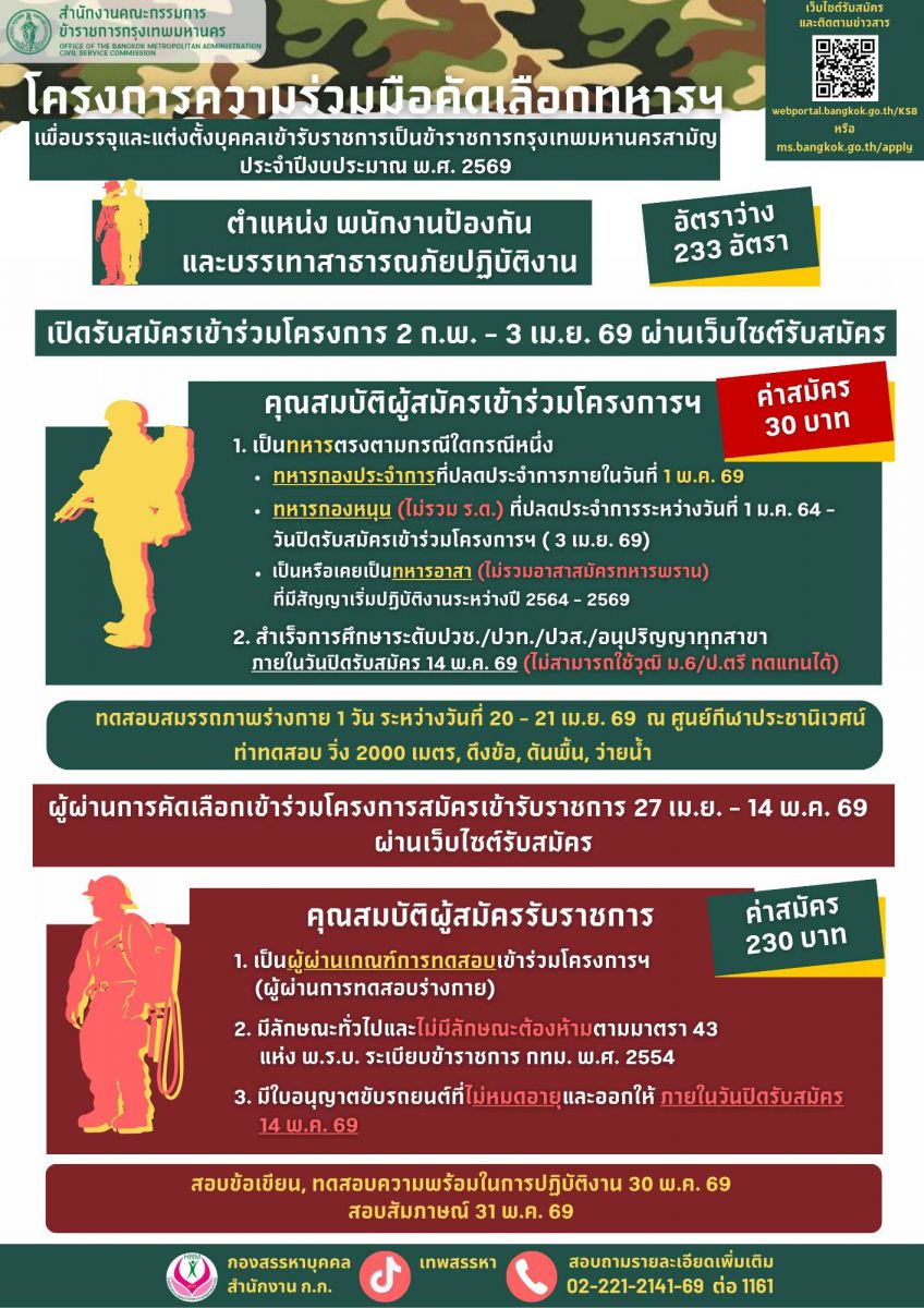 นอกจากนี้ ทางกรุงเทพมหานครยังมีโครงการความร่วมมือคัดเลือกทหารฯ เพื่อบรรจุและแต่งตั้งบุคคลเข้ารับราชการเป็นข้าราชการกรุงเทพมหานครสามัญ ประจำปีงบประมาณ พ.ศ.2569 เปิดรับสมัครตั้ง 2 ก.พ. - 3 เม.ย.69 ผ่านทางเว็บไซต์ webportal.bangkok.go.th/KSB หรือ ms.bangkok.go.th/apply ติดต่อกองสรรหาบุคคล 02-221-2141- 69 ต่อ 1161