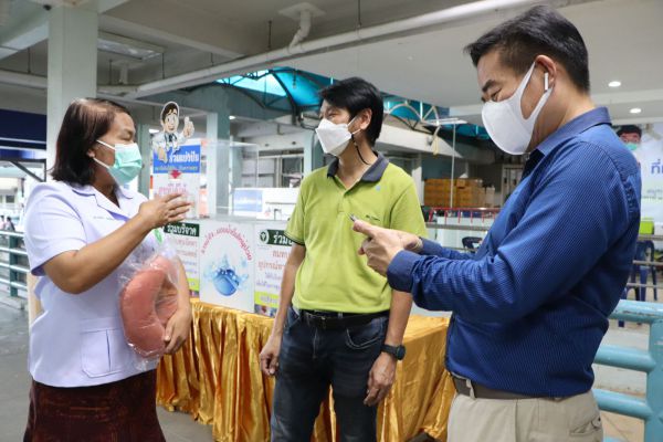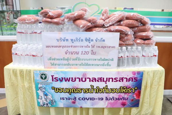 สมุทรสาคร-บริษัททูเกิร์ล ซีฟู้ดส่งตัวแทนมอบเหมอนหนุนช่วยหายใจ 120ใบ น้ำดื่มอีก1,200 ขวดให้โรงพยาบาลสมุทรสาคร