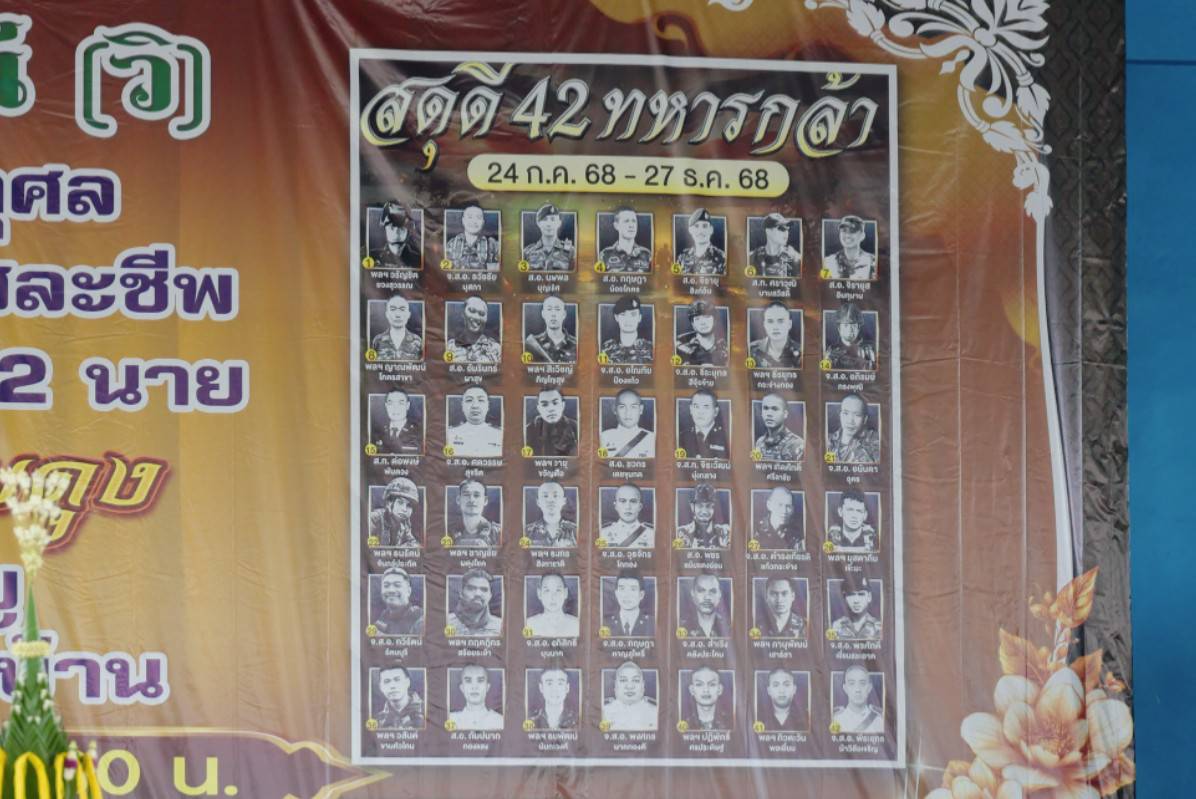 เมื่อวันที่ 16 ม.ค. 2569 ผู้สื่อข่าวรายงานว่า วานนี้ (15 ม.ค. 69) ที่เทศบาลตำบลโพธิ์กระสังข์ อ.ขุนหาญ จ.ศรีสะเกษ พระวัชรญาณมุนี(วิ) เจ้าอาวาสวัดเทพสรธรรมาราม (บาย ตึ๊ก เจีย) จ.ปทุมธานี ได้รับความเมตตาจากพระวชิรสิทธิธาดา เจ้าคณะจังหวัดศรีสะเกษ เป็นประธานฝ่ายสงฆ์ พล.ต.ณัฏฐ์ ศรีอินทร์ รองแม่ทัพภาคที่ 2 เป็นประธานในพิธี และมี หม่อมหลวงปิยาภัสร์ ภิรมย์ภักดี พร้อมด้วย นายสุกิจ เหลืองสกุลไทย รอง ผวจ.ศรีสะเกษ และนายศดิศ ณิชกุล นายอำเภอขุนหาญ นำข้าราชการและชาวบ้านในพื้นที่ร่วมกันประกอบพิธีทำบุญอุทิศส่วนกุศลให้แก่ วีรบุรุษทหารกล้า 42 นาย ที่สละชีพเพื่อปกป้องอธิปไตยของชาติ จากการสู้รบกับทหารกัมพูชา ในช่วงระหว่างวันที่ 24 ก.ค. 2568 ถึง วันที่ 27 ธ.ค. 2568 ที่ผ่านมา
