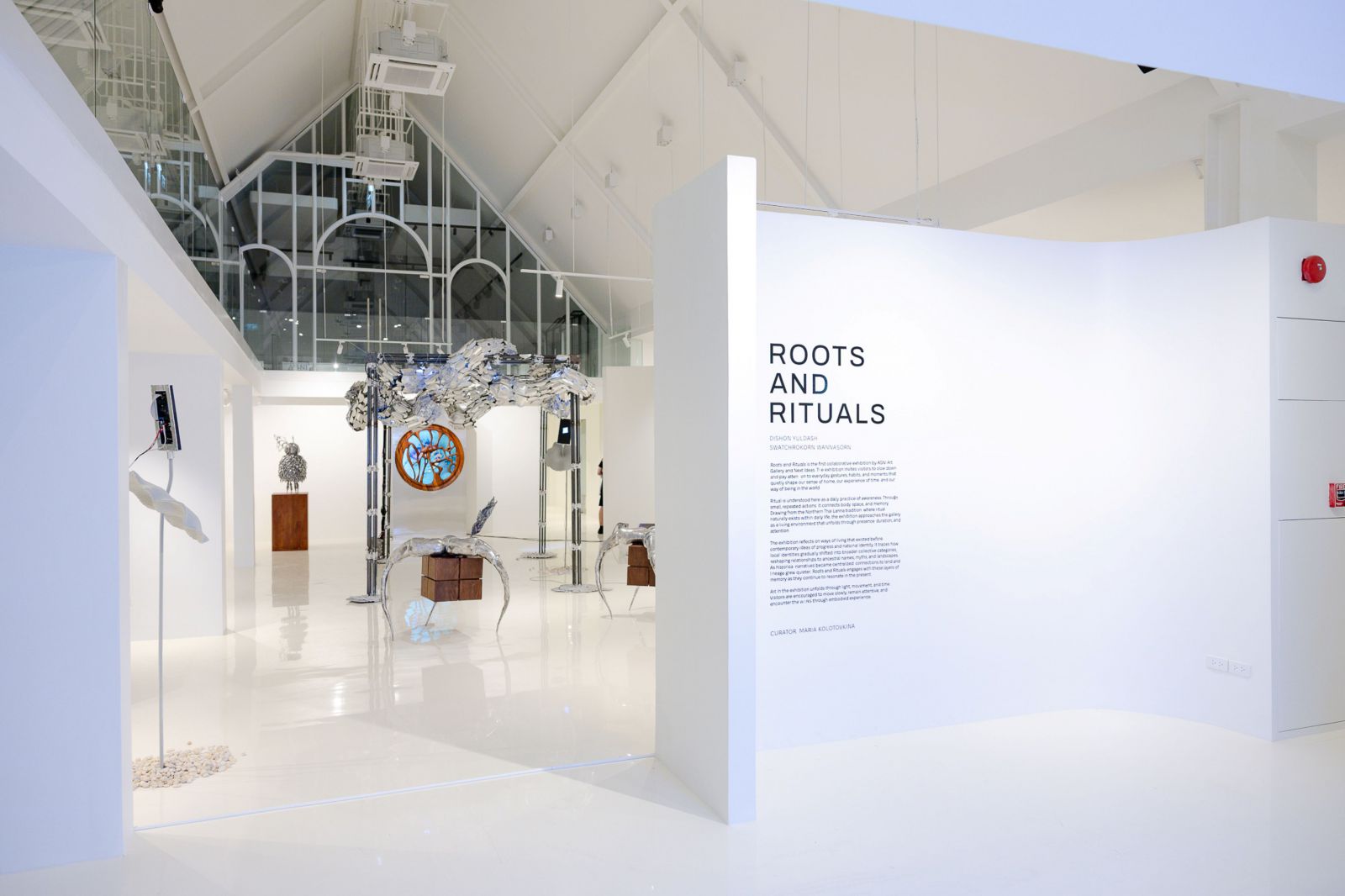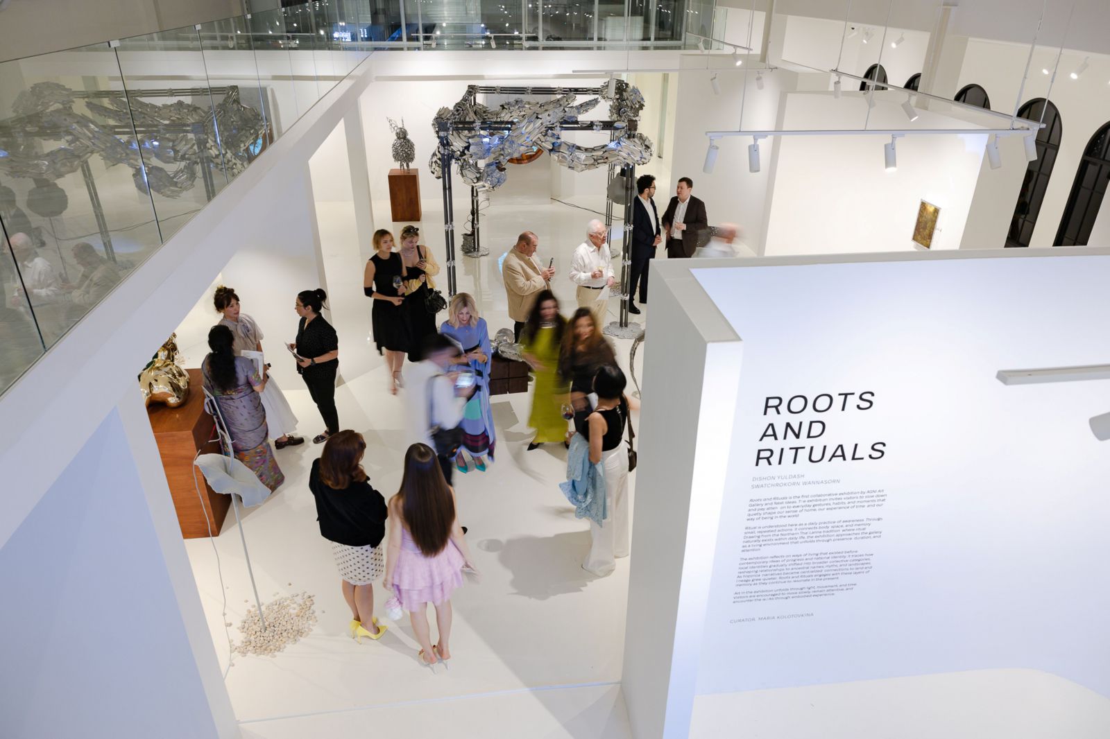 นิทรรศการ Roots & Rituals นำเสนอผลงานของคุณ Dishon Yuldash และ คุณสวัชโรกร วรรณศร โดยคุณ Dishon Yuldash ถ่ายทอดประเด็นเรื่องความทรงจำและการเปลี่ยนแปลงผ่านประติมากรรมที่มีรูปทรงเรียบลื่น ไหลต่อเนื่อง และตอบสนองต่อแสงรวมถึงการเคลื่อนไหวของผู้ชม ขณะที่คุณสวัชโรกร วรรณศร แบบแผนและความเชื่อในวัฒนธรรมภาคเหนือของไทยมาเป็นแรงบันดาลใจ สร้างสรรค์ผลงานจากตำนานและคติความเชื่อเกี่ยวกับการปกป้อง ความแข็งแกร่ง และความสัมพันธ์ระหว่างมนุษย์กับธรรมชาติ ถ่ายทอดผ่านพื้นผิวและวัสดุที่ให้สัมผัสชัดเจน