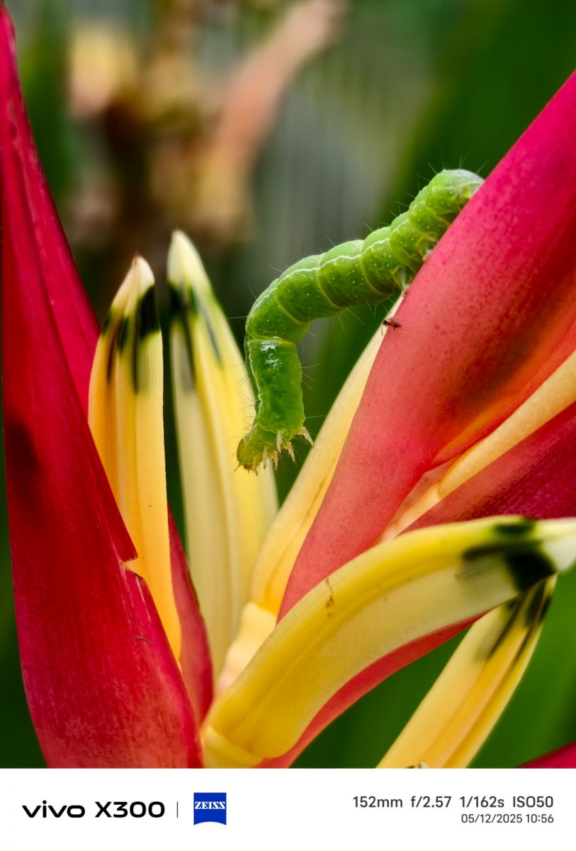 ภาพถ่ายมาโครธรรมชาติของหนอนสีเขียวที่กำลังคืบคลานช้า ๆ บนกลีบดอกไม้ราวกับกำลังสำรวจโลกใบเล็ก ๆ ด้วยการโฟกัสที่แม่นยำ สีสันที่ตัดกันอย่างชัดเจน ความรักที่มีต่อความงามของธรรมชาติและทักษะการสังเกตของผู้ถ่าย จึงแสดงให้เห็นทั้งความเปราะบางของหนอนและพลังแห่งชีวิตอย่างชัดเจน