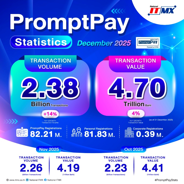 กรุงเทพฯ-PromptPay Monthly Insights : December 2025NITMX เผยยอดธุรกรรมพร้อมเพย์เดือนธันวาคม 2568 แตะ 2.38 พันล้านรายการมูลค่ารวม 4.70 ล้านล้านบาท หนุนเศรษฐกิจปลายปีคึกคัก