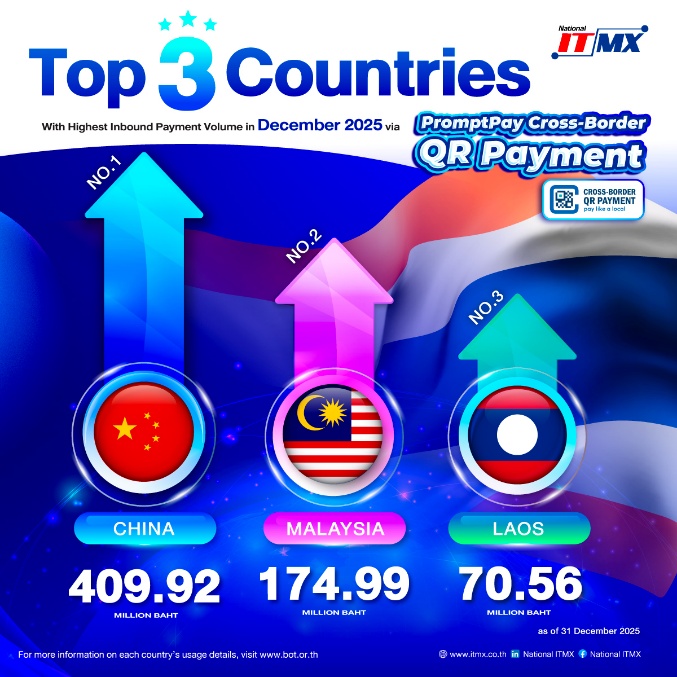 ในเดือนธันวาคม จีนขึ้นนำเป็นประเทศที่มีมูลค่าธุรกรรมขาเข้าสูงสุด จากการขยายความร่วมมือด้านการเชื่อมต่อระบบการชำระเงินข้ามพรมแดน ทำให้ผู้ใช้งานจากจีนสามารถใช้แอปพลิเคชันชำระเงินของตนสแกน QR Code เพื่อชำระค่าสินค้าและบริการในประเทศไทยได้อย่างสะดวก รวดเร็ว และปลอดภัย ช่วยลดอุปสรรคในการใช้จ่ายของนักท่องเที่ยว และสนับสนุนภาคการท่องเที่ยวไทยในช่วงปลายปีได้อย่างเป็นรูปธรรม NITMX ยังคงมุ่งพัฒนาโครงสร้างพื้นฐานระบบการชำระเงินให้มีความทันสมัย ปลอดภัย และรองรับการขยายตัวของธุรกรรมทั้งในประเทศและข้ามพรมแดน เพื่อสนับสนุนการเติบโตของเศรษฐกิจดิจิทัลและภาคการท่องเที่ยวของไทยอย่างยั่งยืน