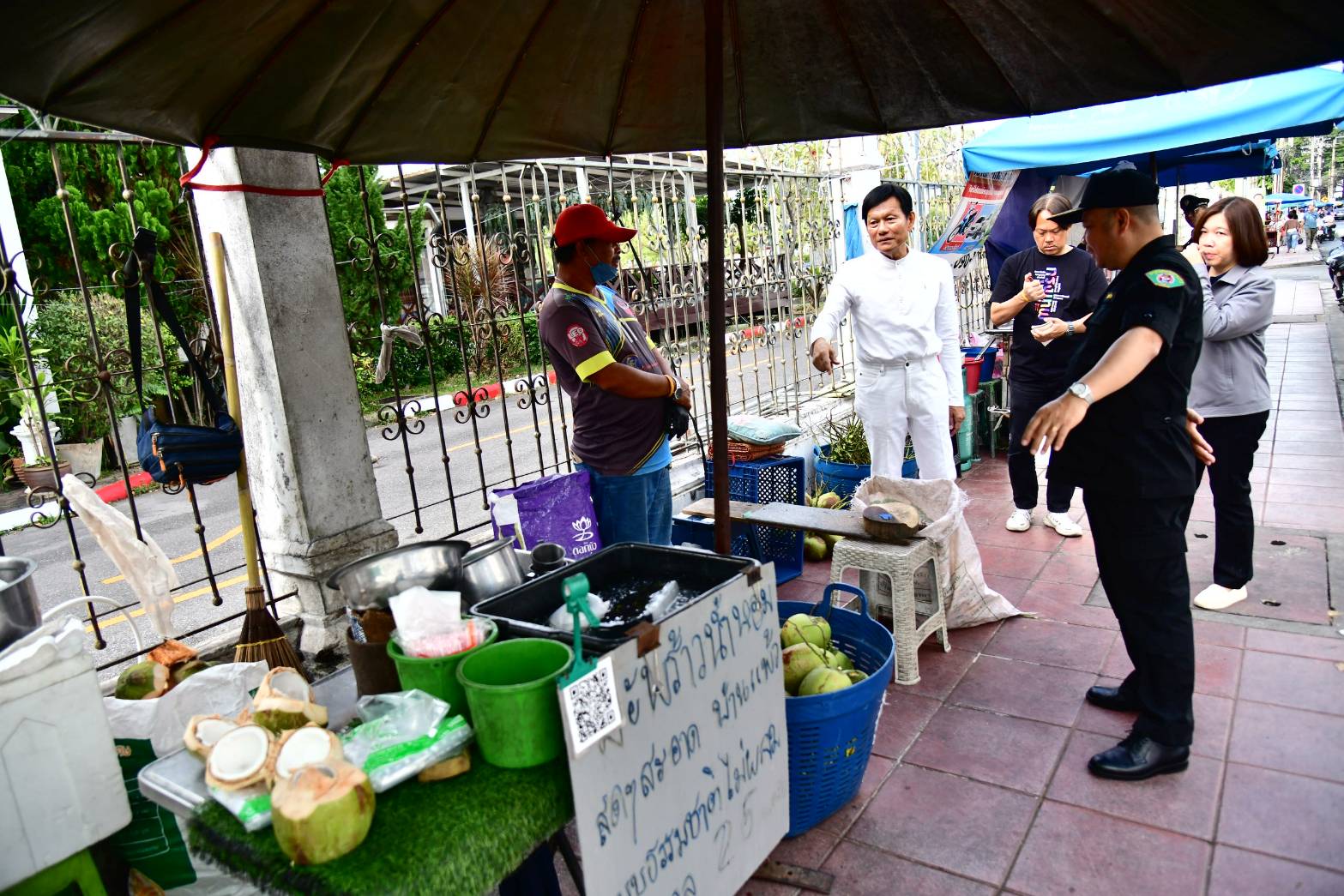 รองผู้ว่าฯ จักกพันธุ์ กล่าวถึงการลงพื้นที่ติดตามการจัดระเบียบพื้นที่ทำการค้าในพื้นที่เขตบางกอกน้อย จำนวน 2 จุด จุดแรกพื้นที่ทำการค้าหน้าไปรษณีย์บางขุนนนท์ ตั้งแต่หอพักคณะพยาบาลศาสตร์ ม.มหิดล ถึงปากซอยบางขุนนนท์ 21 มีผู้ค้า 40 ราย จะเริ่มทำการค้าในช่วงสายไปจนถึงบ่าย ขายอาหารปรุงสำเร็จพร้อมรับประทาน อาทิ หมูทอด ข้าวเหนียว ไส้กรอก กล้วยแขก ขนมครก ขนมหวาน โดยผู้ค้าจะตั้งวางแผงค้าขายสินค้าและนำรถเข็นมาจอดขายบนทางเท้าด้านที่ติดกับผิวการจราจร ที่ผ่านมา เขตฯ ได้ประชุมสร้างความเข้าใจแก่ผู้ค้าให้ปรับลดขนาดของแผงค้าให้เล็กลง เนื่องจากความกว้างของทางเท้ามีขนาดเล็กและคับแคบ เมื่อตั้งวางแผงค้าแล้ว ประชาชนไม่สามารถเดินสวนกันได้สะดวก โดยผู้ค้าได้ปรับลดขนาดของแผงค้าให้เล็กลง เว้นช่องว่างทางเดินเข้าออก ทั้งนี้ จากการตรวจพื้นที่ในจุดดังกล่าวพบว่า ยังมีผู้ค้าบางรายตั้งวางรถเข็นขายสินค้าทิ้งไว้ ไม่จัดเก็บอุปกรณ์ทำการค้าหลังเลิกทำการค้าในแต่ละวัน การตั้งวางแผงค้ายังกระจัดกระจายกันอยู่ ไม่รวมกันเป็นกลุ่มในพื้นที่เดียวกัน