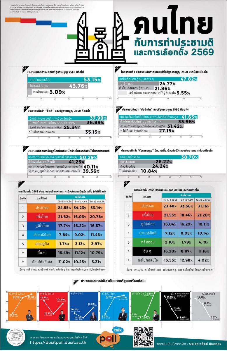 สวนดุสิตโพล มหาวิทยาลัยสวนดุสิต สำรวจความคิดเห็นประชาชน เรื่อง คนไทยกับการทำประชามติและการเลือกตั้ง 2569 ในประเด็นเกี่ยวกับการทำประชามติ พบว่า กลุ่มตัวอย่าง 53.15% เคยอ่าน/ศึกษารัฐธรรมนูญ 2560 บางส่วน โดยรวมคิดว่าตนเองเข้าใจรัฐธรรมนูญ 2560 เล็กน้อย 47.82% ข้อดี คือ มีกลไกตรวจสอบนักการเมืองเข้มแข็ง 37.99% ข้อจำกัด คือ เปิดช่องให้กลไกที่ไม่ได้มาจากการเลือกตั้งมีอำนาจสูง 41.65% และข้อมูลเพิ่มเติมที่ต้องการรู้เพื่อช่วยในการตัดสินใจโหวตประชามติ คือ บทบาทการมีส่วนร่วมของประชาชนในรัฐธรรมนูญ 50.29%