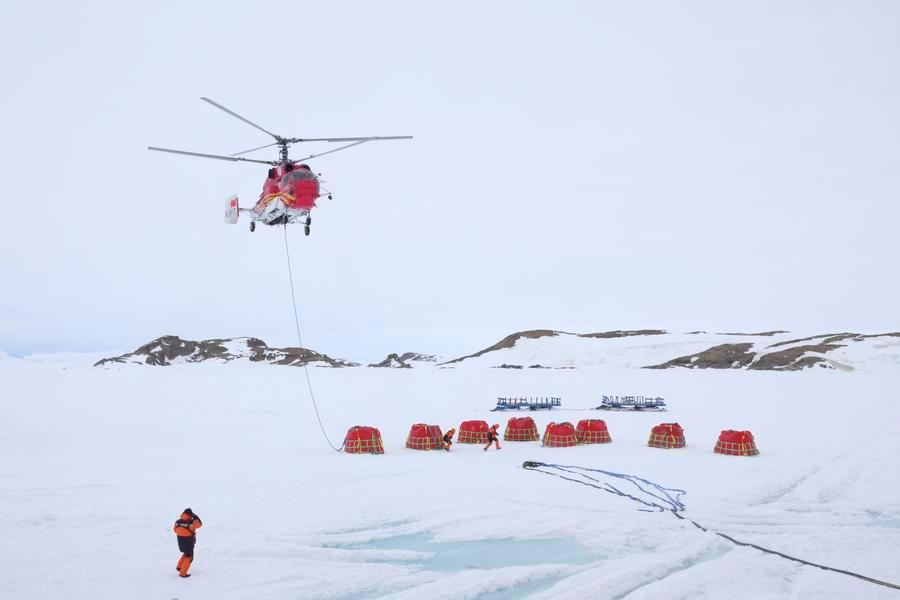 (แฟ้มภาพซินหัว : เฮลิคอปเตอร์เคลื่อนย้ายถุงบรรจุเชื้อเพลิง ระหว่างการปฏิบัติภารกิจของคณะสำรวจแอนตาร์กติกาชุดที่ 42 ของจีน ณ บริเวณใกล้กับสถานีจงซาน ซึ่งเป็นฐานวิจัยของจีนในทวีปแอนตาร์กติกา วันที่ 2 ธ.ค. 2025)