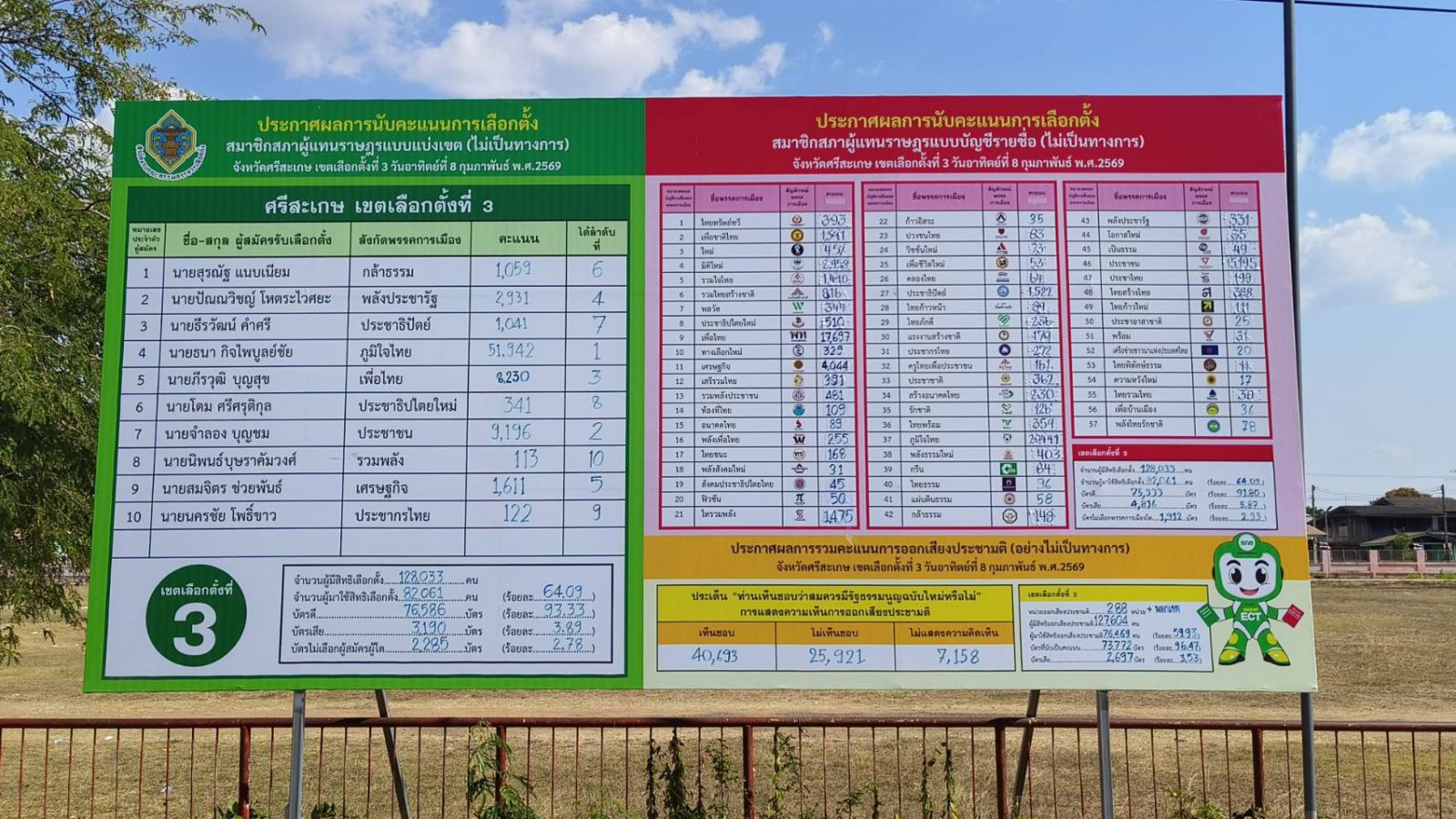 นายหมวดโทกฤติเดช ดารารัตน์ ผู้อำนวยการเลือกตั้งประจำเขต 3 จ.ศรีสะเกษ กล่าวว่า ยอมรับว่าเกิดจากข้อผิดพลาดของทางเจ้าหน้าที่เอง ทำให้ข้อมูลคลาดเคลื่อน เนื่องจากไม่ได้นำเอาผลคะแนนการเลือกตั้งนอกเขต แบบบัญชีรายชื่อ จำนวน 5,556 คะแนน มารวมคะแนนการเลือกตั้งในเขต เมื่อวันที่ 8 ก.พ. 2569 หลังนับคะแนนเสร็จสิ้น เจ้าหน้าที่จึงได้นำตัวเลขผลคะแนนการเลือกตั้งในเขต ไปเขียนขึ้นป้ายประกาศที่หน้าที่ว่าการอำเภอศรีรัตนะ โดยนำข้อมูลเฉพาะผลคะแนนเลือกตั้งในเขต จำนวน 69,777 คะแนน ไปเขียนขึ้นป้าย ทำให้จำนวนบัตรเลือกตั้งแบบบัญชีรายชื่อที่เขียนบนกระดาน หายไปจำนวน 5,556 คะแนน เมื่อเจ้าหน้าที่รับทราบข้อผิดพลาดแล้ว จึงรีบดำเนินการตรวจสอบและเร่งแก้ไข เพื่อให้ถูกต้อง โดยการนำผลคะแนนของการเลือกตั้งนอกเขต มารวมกันกับผลคะแนนเลือกตั้งในเขต ได้ผลคะแนนรวม 75,333 คะแนน ซึ่งครบถ้วนถูกต้อง