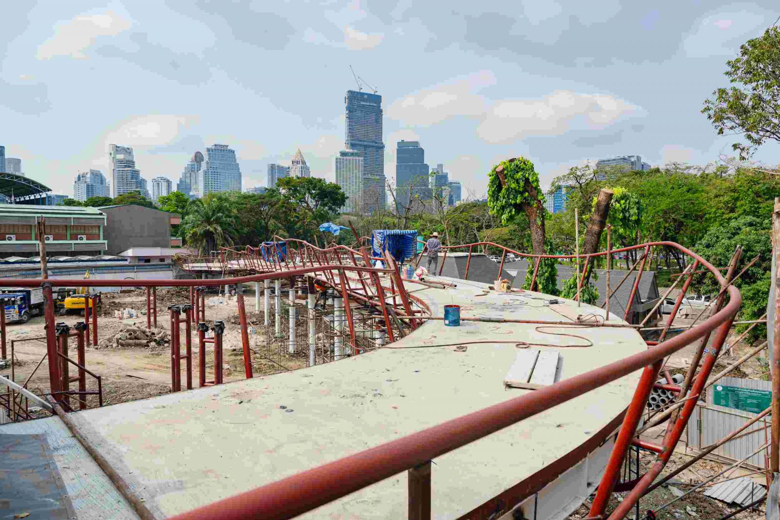 3. มิติพื้นที่กิจกรรม (Sport & Social Space) สะพานเขียวถูกยกระดับให้เป็น “พื้นที่กิจกรรมกลางเมือง” ไม่ใช่เพียงทางผ่าน ปรับพื้นผิวเป็น Sport Surface ระยะทางประมาณ 500 เมตร ช่วยลดแรงกระแทก เหมาะสำหรับการวิ่งและปั่นจักรยาน สร้างลานกิจกรรมอเนกประสงค์เหนือจุดตัดสำคัญ เช่น เหนือทางด่วนเฉลิมมหานครและเหนือคลองไผ่สิงโตจัดพื้นที่เป็นจุดเช็กอิน มุมพักผ่อน และพื้นที่เรียนรู้กลางแจ้ง พื้นที่ดังกล่าวสามารถรองรับกิจกรรมชุมชน กิจกรรมสุขภาพ และกิจกรรมสร้างสรรค์ของคนเมืองทุกช่วงวัย