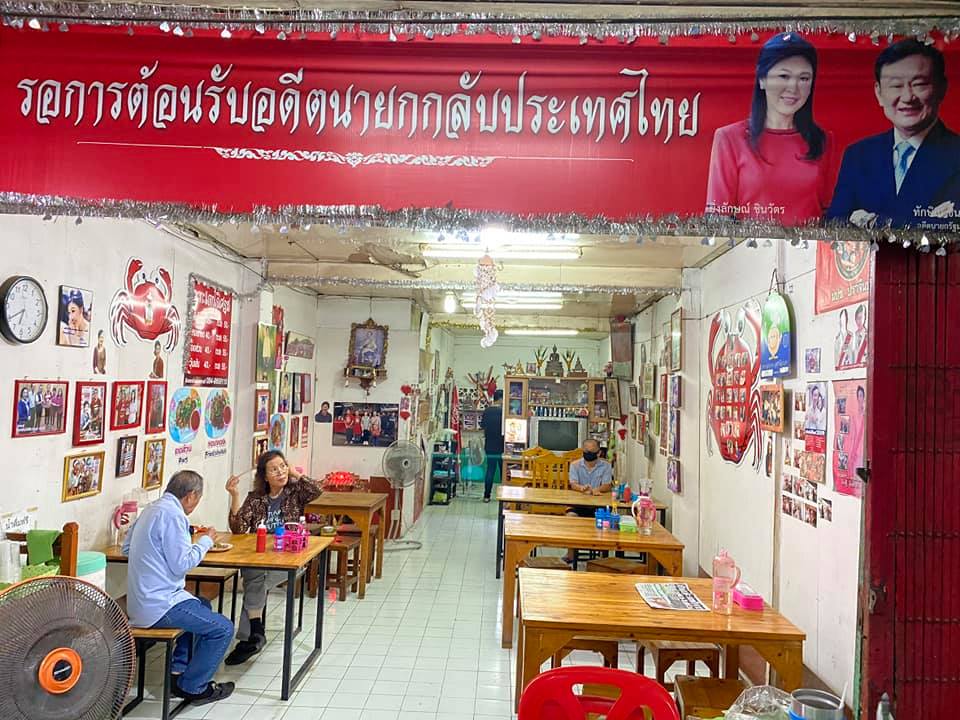 สัญลักษณ์เชิงประจักษ์ หน้าร้านประดับโปสเตอร์ขนาดใหญ่ (80 ซม. x 1 เมตร) แสดงความยินดีกับ น.ส.แพทองธาร ชินวัตร นายกรัฐมนตรีคนที่ 31 พร้อมป้ายคู่ของนายทักษิณและ น.ส.ยิ่งลักษณ์ ที่ระบุข้อความ "รออดีตนายกฯ กลับประเทศไทย"