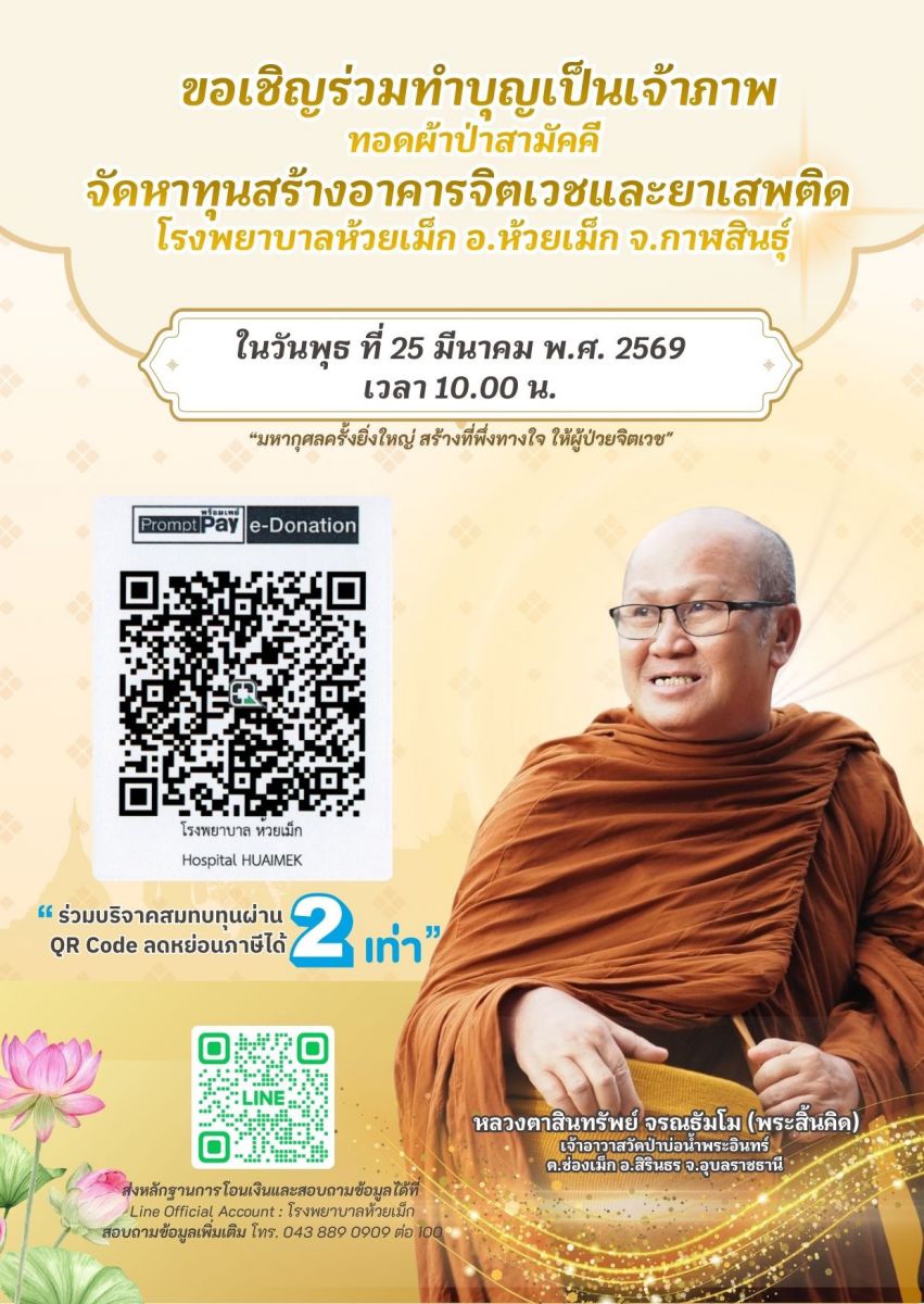 นพ.วิษณุกร อ่อนประสงค์ ผู้อำนวยการโรงพยาบาลห้วยเม็ก จ.กาฬสินธุ์ กล่าวว่า ตามที่โรงพยาบาลห้วยเม็ก โดยคณะผู้บริหาร บุคลากร เจ้าหน้าที่ แพทย์ พยาบาล ได้ร่วมกับคณะสงฆ์ และส่วนราชการทุกภาคส่วนในพื้นที่ จัดโครงการทอดผ้าป่าสามัคคี สร้างอาคารจิตเวชและยาเสพติด ให้กับ รพ.ห้วยเม็ก กำหนดการจัดงานวันพุธที่ 25 มีนาคม 2569 ที่จะถึงนั้น จึงได้ขอเชิญชวน พี่น้องประชาชน ผู้มีจิตศรัทธา ส่วนราชการ รัฐวิสาหกิจ ได้ร่วมเป็นส่วนหนึ่ง ในการเป็นเจ้าภาพทำบุญใหญ่ โดยร่วมบริจาคปัจจัย เพื่อสมทบทุนทอดผ้าป่าสามัคคี เพื่อสร้างอาคารจิตเวชและยาเสพติด ให้กับโรงพยาบาลห้วยเม็กในครั้งนี้ โดยพร้อมเพรียงกัน