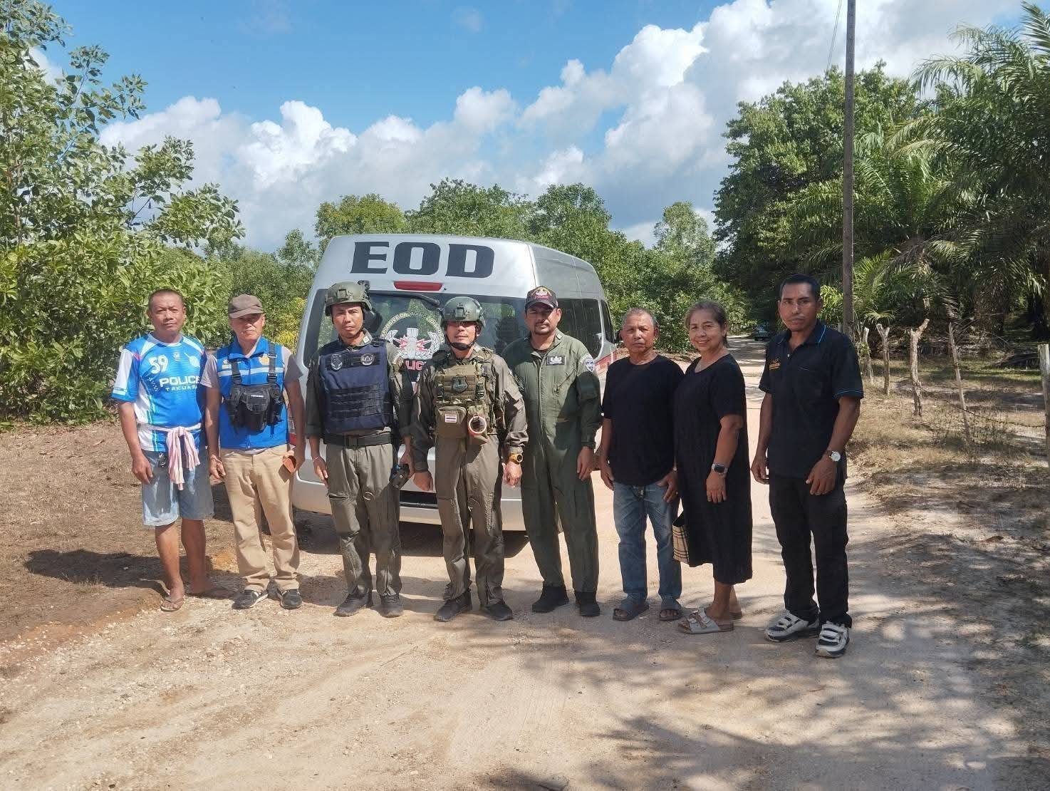 เมื่อวันที่ 28 กุมภาพันธ์ 2569 เวลา 07.00 น. นายดำรง ฉิมทับ นายอำเภอตะกั่วป่า พร้อมด้วย นายศุภฤกษ์ เกตุสุรินทร์ ปลัดอาวุโสอำเภอตะกั่วป่า ได้รับแจ้งจาก นายดลเลาะ หัสนีย์ ผู้ใหญ่บ้านหมู่ 9 ต.โคกเคียน อ.ตะกั่วป่า ว่าชาวบ้านในพื้นที่พบวัสดุต้องสงสัยคล้ายกระสุนปืนขนาดใหญ่ บริเวณซอยหินสามก้อน หมู่ 9 ต.โคกเคียน อ.ตะกั่วป่า จ.พังงา ภายหลังรับแจ้ง ผู้ใหญ่บ้านได้ลงพื้นที่ตรวจสอบเบื้องต้น และประสานเจ้าหน้าที่ตำรวจ สภ.ตะกั่วป่า เพื่อขอสนับสนุนชุดเก็บกู้วัตถุระเบิด (EOD) เข้าดำเนินการ