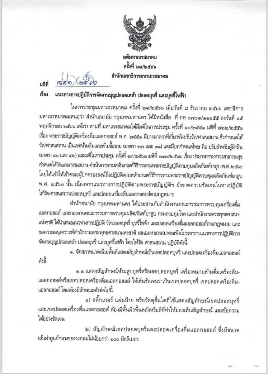 ล่าสุด เมื่อวันที่ 28 ก.พ. 2569 พระวชิรสิทธิธาดา เจ้าคณะจังหวัดศรีสะเกษ ได้ลงนามในหนังสือสั่งการด่วนที่สุด ถึง เจ้าคณะอำเภอทุกอำเภอ ทั้ง 22 อำเภอ ในพื้นที่ จ.ศรีสะเกษ เรื่อง แนวทางการปฏิบัติการจัดงานบุญปลอดเหล้า ปลอดบุหรี่ และบุหรี่ไฟฟ้า โดยมีข้อความระบุว่า ด้วยในการประชุมมหาเถรสมาคม ครั้งที่ 29/2566 เมื่อวันที่ 8 ธ.ค. 2566 เลขาธิการมหาเถรสมาคมเสนอว่า สำนักอนามัยกรุงเทพมหานคร ได้มีหนังสือ ที่ กท 0709/11155 ลงวันที่ 15 พ.ย. 2566 แจ้งว่า ตามที่ มหาเถรสมาคมได้มีมติในการประชุม ครั้งที่ 10/2551 มติที่ 222/2551 เรื่อง พระราชบัญญัติเครื่องดื่มแอลกอฮอล์ พ.ศ. 2551 มีบางมาตราที่เกี่ยวข้องกับวัด/ศาสนสถาน ซึ่งกำหนดให้วัด/ศาสนสถาน เป็นเขตห้ามดื่มและห้ามชื้อขาย มาตามมาตรา 27 และ 31 และมีบทกำหนดโทษ คือ ปรับสำหรับผู้ฝ่าฝืน ตามมาตรา 40 และ 42