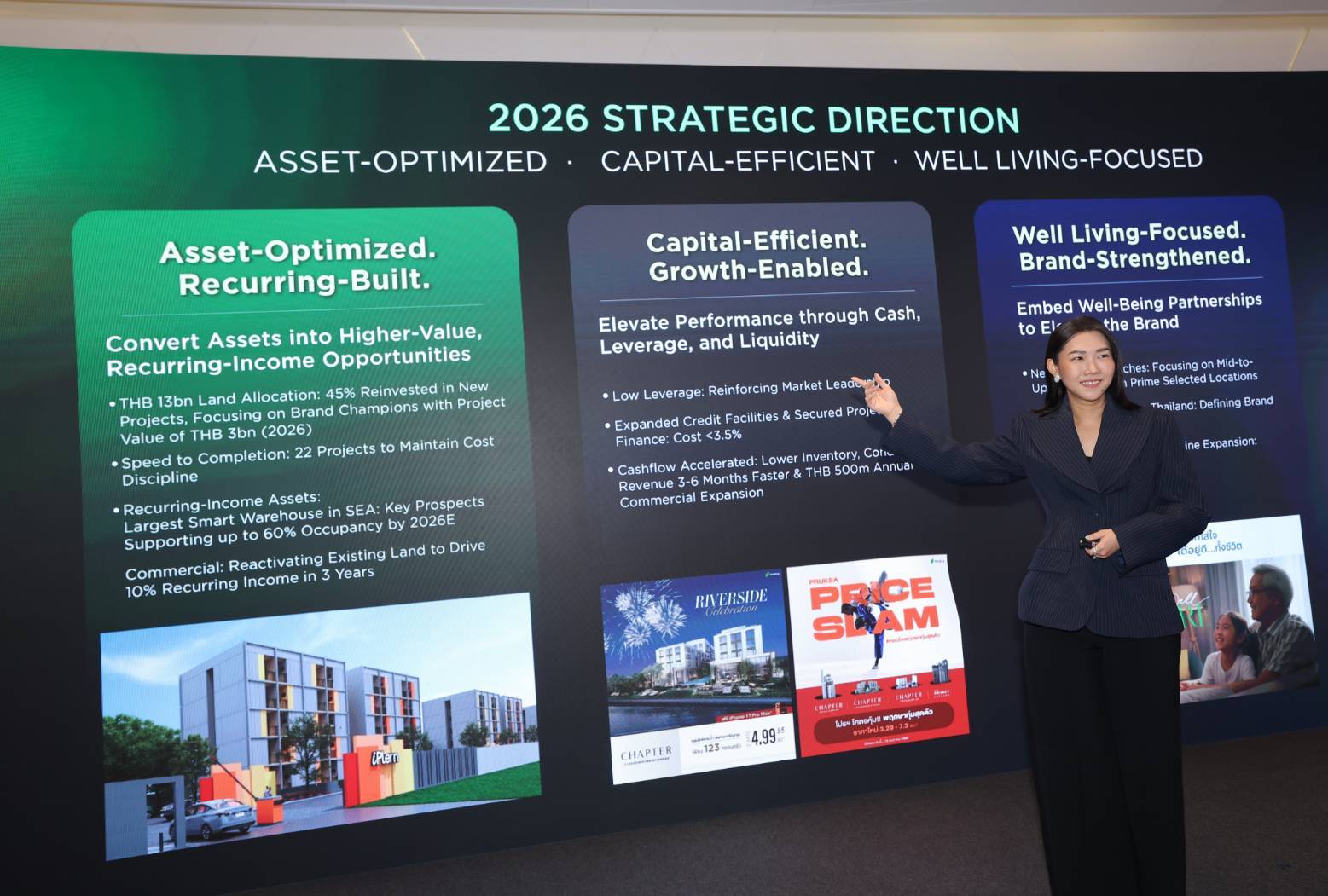 ในมิติแรก “Asset-Optimized, Recurring-Built” บริษัทฯ เดินหน้ากลยุทธ์เชิงรุกเพื่อเพิ่มสัดส่วนรายได้ประจำ (Recurring Income) ผ่านการบริหารจัดการพอร์ตที่ดินมูลค่ากว่า 12,800 ล้านบาท เปลี่ยนสินทรัพย์ให้เป็นรายได้ผ่านการพัฒนาโครงการที่อยู่อาศัยและการสร้างรายได้จากการเช่ารูปแบบใหม่ ๆ อาทิ กลุ่มเฮลท์แคร์, อะพาร์ตเมนต์, ไฮบริด เรสซิเด้นท์ และคลังสินค้า พร้อมกันนี้ บริษัทฯ ได้วางโรดแมปเร่งสปีดการพัฒนาและการโอนกรรมสิทธิ์ โดยตั้งเป้าปิดโครงการรวม 22 โครงการ เพื่อเพิ่มประสิทธิภาพการบริหารจัดการต้นทุนและลดภาระในการดูแลสินค้าคงคลังอย่างเป็นระบบ สำหรับความคืบหน้าในธุรกิจคลังสินค้า “โอเมก้า บางนา โลจิสติกส์ แคมปัส” ซึ่งเป็นคลังสินค้าอัจฉริยะบนพื้นที่กว่า 217,000 ตารางเมตร ที่ถือเป็นหนึ่งในคลังสินค้าขนาดใหญ่ที่สุดในภูมิภาคเอเชียตะวันออกเฉียงใต้ โดยพัฒนาร่วมกับพันธมิตรระดับโลก เพื่อรองรับศักยภาพด้าน โลจิสติกส์ การกระจายสินค้า และสอดรับกับแนวโน้มเศรษฐกิจยุคใหม่ บริษัทฯ จะเริ่มรับรู้รายได้ในไตรมาส 3 พร้อมได้รับความเชื่อมั่นจากพันธมิตรรายใหญ่ในกลุ่มโลจิสติกส์และอีคอมเมิร์ช โดยคาดว่าจะมียอดจองพื้นที่กว่า 60% ขณะเดียวกันบริษัทฯ ได้นำที่ดินจากพอรต์ที่มีอยู่มาพัฒนาโครงการ และเพิ่มสัดส่วนบ้านในเซ็กเมนต์กลางถึงบน เพื่อสร้างกระแสเงินสดหมุนเวียน สำหรับรองรับการขยายตัวของธุรกิจในอนาคตได้อย่างมีประสิทธิภาพ