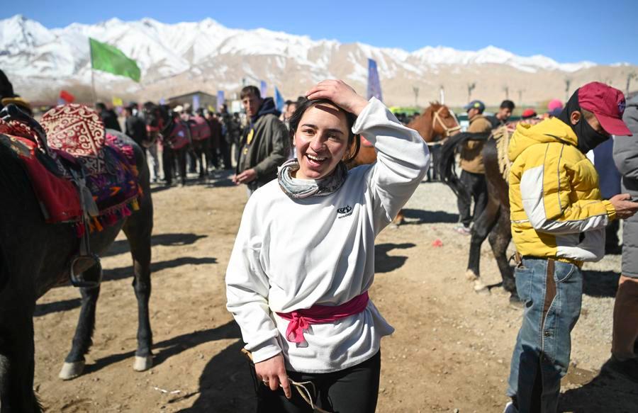 (แฟ้มภาพซินหัว : กูลิซา ดิฮัน จูงม้าของเธอเพื่อวอร์มอัพร่างกายก่อนเริ่มการแข่งขัน ในแคว้นปกครองกลุ่มชาติพันธุ์ทาจิก ทัชคูร์กัน เขตปกครองตนเองซินเจียงอุยกูร์ ทางตะวันตกเฉียงเหนือของจีน)
