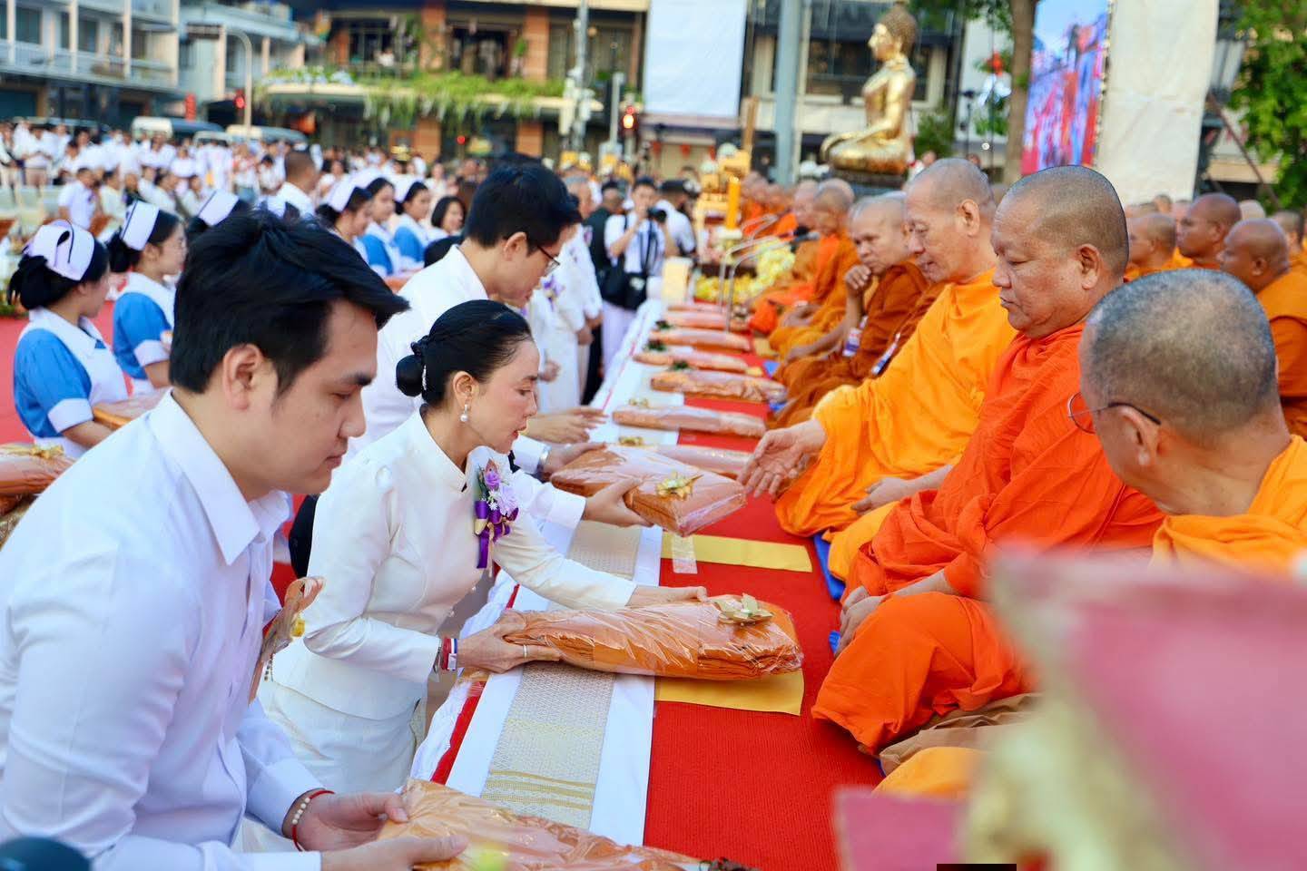 พระสงฆ์จาก 6 จังหวัดภาคอีสานร่วมเจริญพระพุทธมนต์ ก่อนจะแปรแถวรับบิณฑบาตตลอดแนวถนนรอบลานย่าโม สร้างภาพแห่งศรัทธาและความสามัคคีของชาวโคราชอย่างยิ่งใหญ่