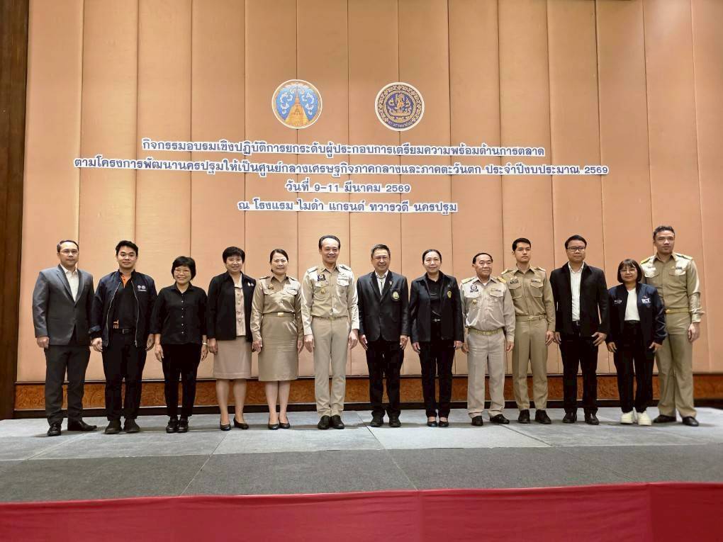 วันที่ 9 มีนาคม พ.ศ. 2569 นายสมาวิษฎ์ สุพรรณไพ รองผู้ว่าราชการจังหวัดนครปฐม เป็นประธานเปิดอบรมเชิงปฏิบัติการยกระดับผู้ประกอบการเตรียมคามพร้อมด้านการตลาด ตามโครงการพัฒนานครปฐมให้เป็นศูนย์กลางเศรษฐกิจภาคกลางและภาคตะวันตก ที่ห้องทวารวดี 2 โรงแรมไมด้า แกรนด์ ทวารวดีนครปฐม โดยมีหัวหน้าส่วนราชการ วิทยากรผู้ทรงคุณวุฒิ และผู้ประกอบการด้านอาหารของจังหวัดนครปฐม เข้าร่วมอบรมในครั้งนี้