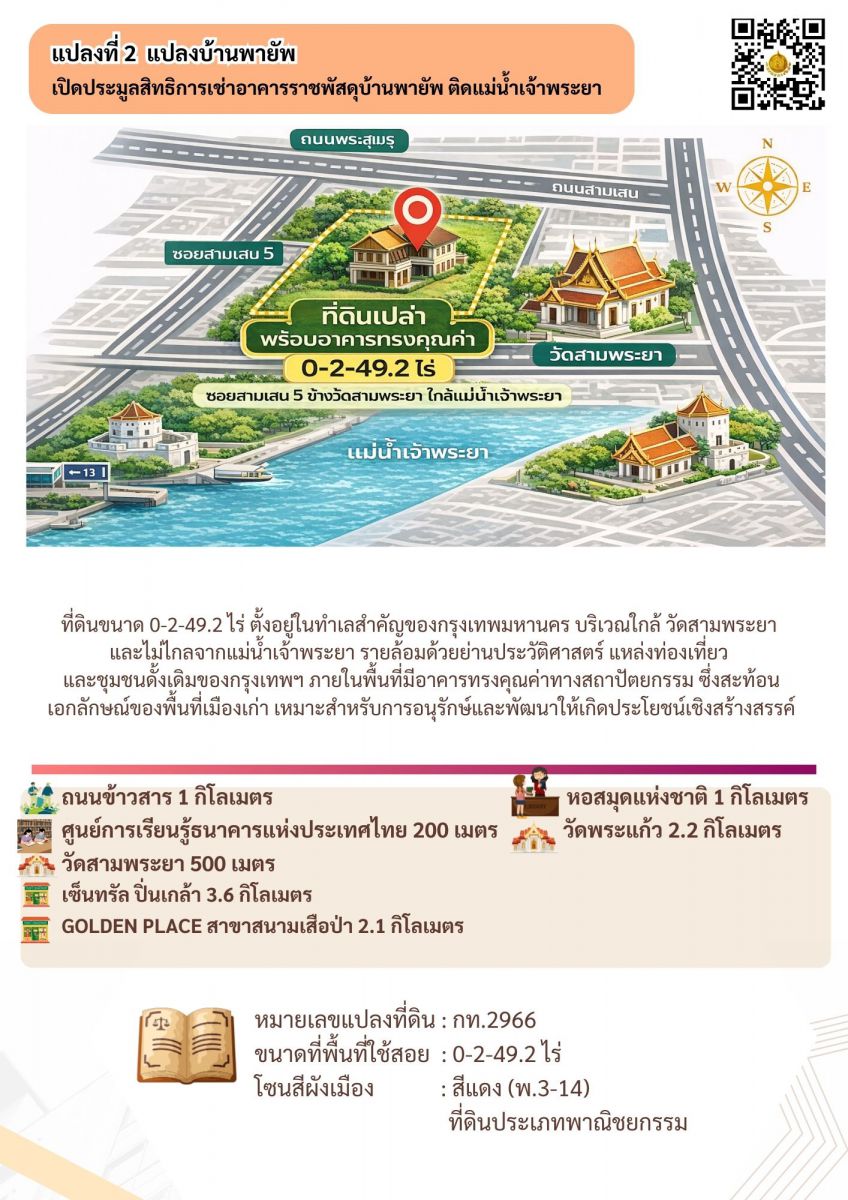 2. แปลงบ้านพายัพ เปิดประมูลสิทธิการเช่าอาคารราชพัสดุบ้านพายัพ ใกล้แม่น้ำเจ้าพระยา (บ้านพายัพ)เขตพระนคร ซึ่งเป็นอาคารราชพัสดุ จำนวน 3 รายการ พื้นที่ใช้สอย 465.44 ตารางเมตร บนที่ดินขนาดเนื้อที่ 0-2-49.2 ไร่ ตั้งอยู่ในทำเลสำคัญของกรุงเทพมหานคร ละแวกวัดสามพระยา รายล้อมด้วยย่านประวัติศาสตร์ แหล่งท่องเที่ยว และชุมชนดั้งเดิมของกรุงเทพฯ ภายในพื้นที่มีอาคารทรงคุณค่าทางสถาปัตยกรรม ซึ่งสะท้อนเอกลักษณ์ของพื้นที่เมืองเก่า เหมาะสำหรับการอนุรักษ์และพัฒนาให้เกิดประโยชน์เชิงสร้างสรรค์