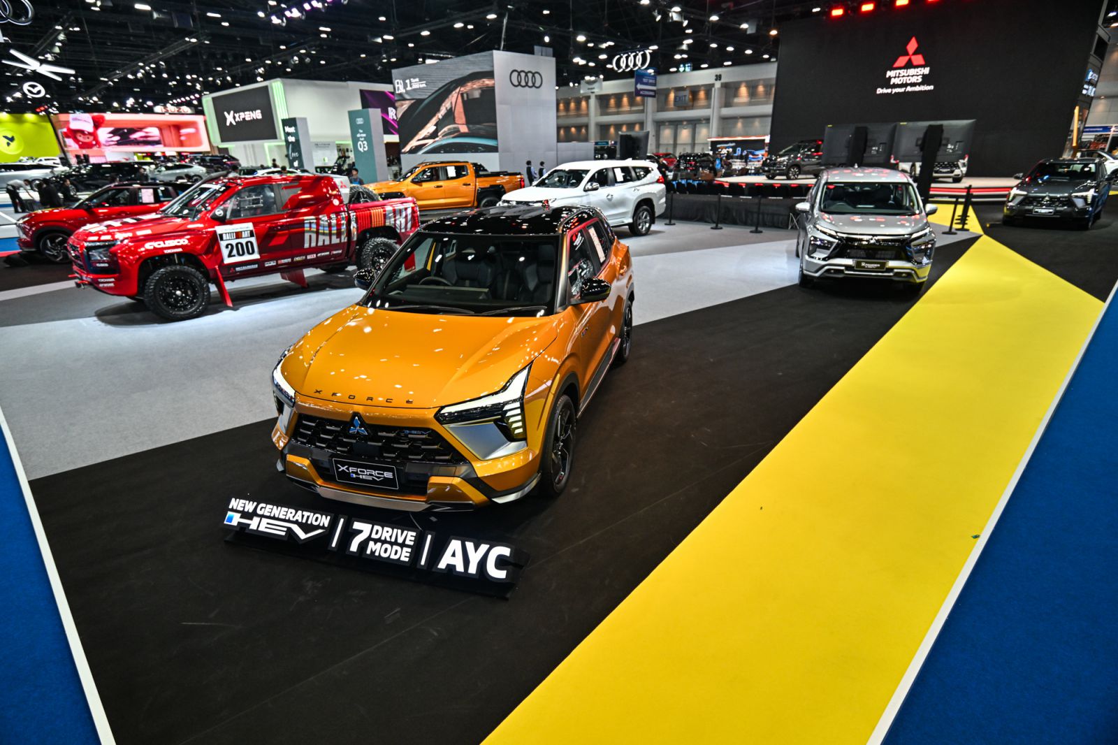 รถยนต์ไฮไลต์ภายในบูธ นำโดย ออล-นิว มิตซูบิชิ เอ็กซ์ฟอร์ส เอชอีวี รถยนต์คอมแพกต์เอสยูวีฟูลไฮบริดรุ่นล่าสุด ที่มียอดส่งมอบแล้วกว่า 10,000 คัน ภายในระยะเวลาเพียง 1 ปี นับตั้งแต่เปิดตัวในประเทศไทย การันตีความคุ้มค่าและคุณภาพด้วยรางวัลรถยนต์ยอดเยี่ยมประจำปี 2568 จากสมาคมผู้สื่อข่าวรถยนต์และรถจักรยานยนต์ไทย (สรยท.) โดยรถยนต์รุ่นนี้มุ่งมอบประสบการณ์ “Xperience the Force” ที่ทั้งขับสนุก เร้าใจ และทรงพลัง ตอบโจทย์สไตล์คนเมือง ด้วย MITSUBISHI e:MOTION ที่ยกระดับการขับขี่ผ่านระบบขับเคลื่อนฟูลไฮบริดเจเนอเรชันใหม่ โหมดการขับขี่ 7 รูปแบบ (7 Drive Mode) และระบบควบคุมการขับเคลื่อนและสมดุลขณะเข้าโค้ง (Active Yaw Control – AYC) ผสานกับช่วงล่างและระบบกันสะเทือนที่พัฒนาขึ้นใหม่ให้เหมาะสมกับสภาพถนนในประเทศไทย จากการทดสอบจริงบนถนนทั่วประเทศรวมระยะทางกว่า 100,000 กิโลเมตร เพื่อมอบความมั่นใจในทุกการเดินทางทั้งในเมืองและนอกเมือง