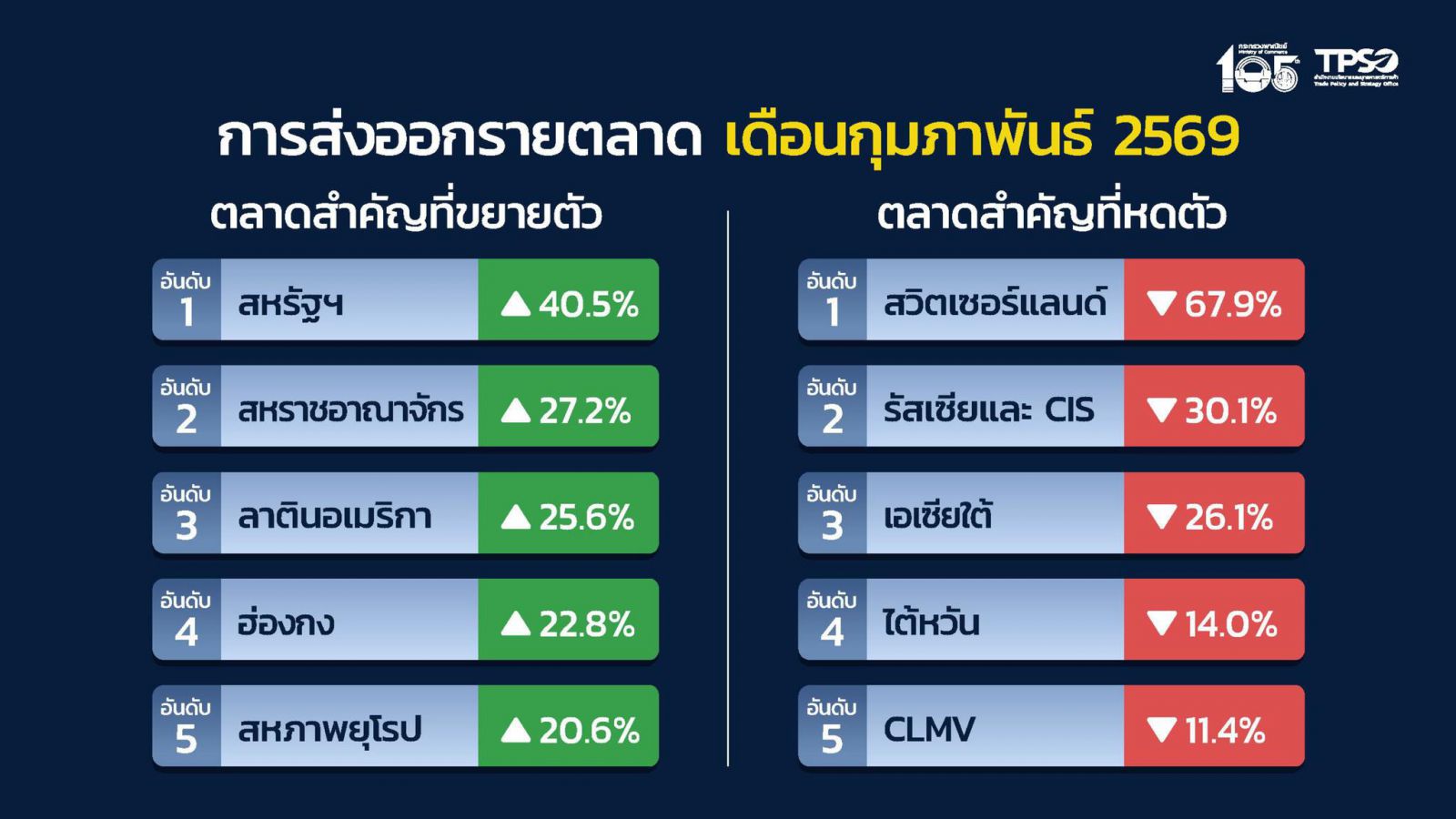 นางสาวณัฐิยา สุจินดา รองผู้อำนวยการสำนักงานนโยบายและยุทธศาสตร์การค้า (สนค.) แถลงการส่งออกของไทยในเดือนกุมภาพันธ์ 2569 มีมูลค่า 29,439.7 ล้านดอลลาร์สหรัฐ (912,567 ล้านบาท) ขยายตัวต่อเนื่องเป็นเดือนที่ 20 ที่ร้อยละ 9.9 หากหักสินค้าเกี่ยวเนื่องกับน้ำมัน ทองคำ และยุทธปัจจัย ขยายตัวที่ร้อยละ 11.0 แรงขับเคลื่อนหลักของการส่งออกยังคงเป็นสินค้าอิเล็กทรอนิกส์และเครื่องใช้ไฟฟ้าที่เติบโตตามการอัปเกรดเทคโนโลยีสมัยใหม่สู่ยุค AI และการกระจายความเสี่ยงในห่วงโซ่อุปทานจากความตึงเครียดด้านภูมิรัฐศาสตร์ที่มีต่อเนื่อง ในขณะที่การส่งออกสินค้าเกษตรและอาหารศักยภาพขยายตัวอย่างแข็งแกร่ง เช่น ทุเรียนสด เงาะสด ลำไยสด สับปะรดสด ไขมันและน้ำมันจากพืชและสัตว์ อาหารสัตว์เลี้ยง ไก่แปรรูป เป็นต้น ทั้งนี้ การส่งออก 2 เดือนแรกของปี 2569 ขยายตัวที่ร้อยละ 17.0 หากหักสินค้าเกี่ยวเนื่องกับน้ำมัน ทองคำ และยุทธปัจจัย ขยายตัวที่ร้อยละ 15.8