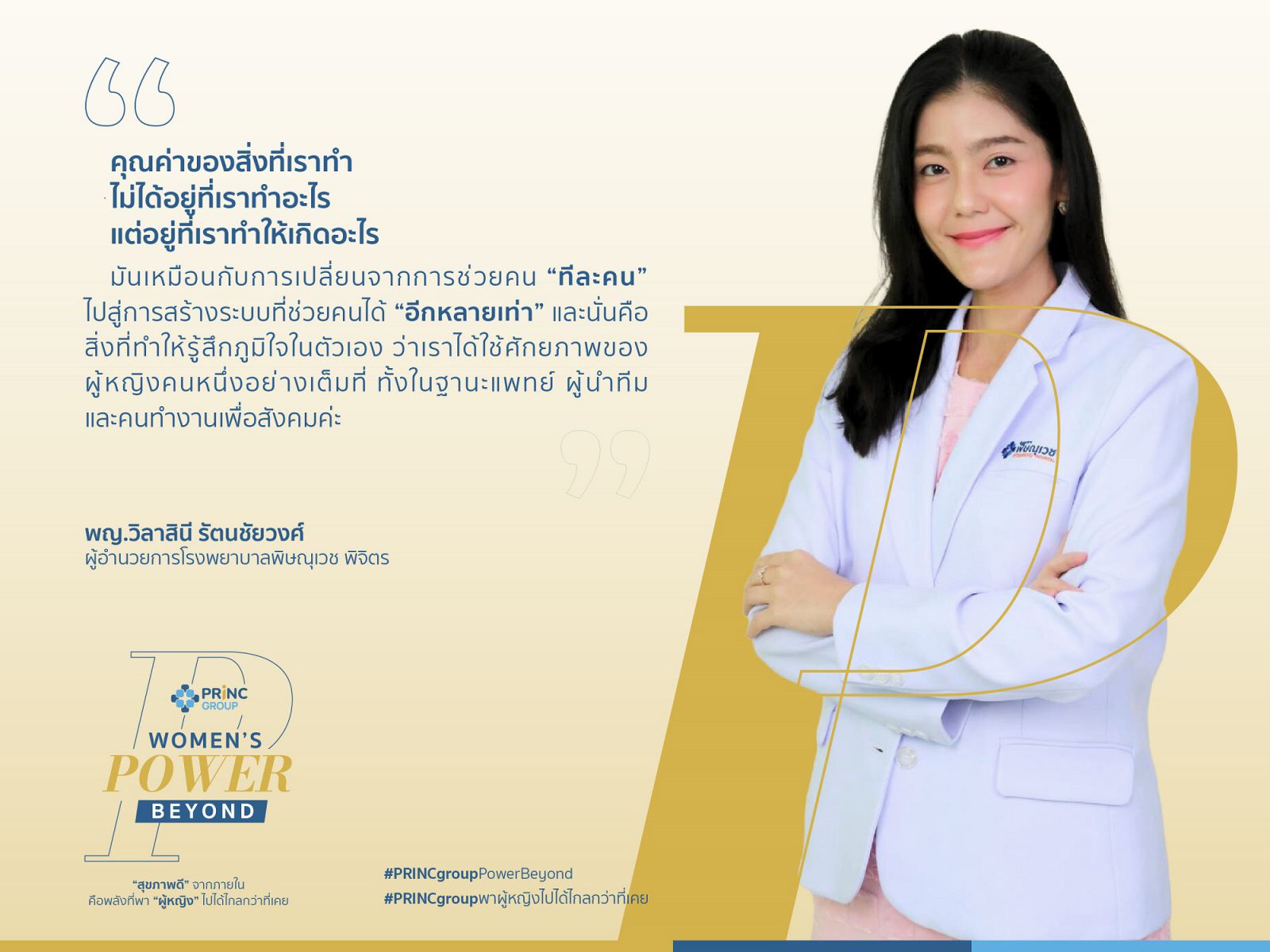 พญ.ปาริชาติ เมืองไทย ผู้อำนวยการโรงพยาบาลพริ้นซ์ ศรีสะเกษ กล่าวว่า “ก่อนจะก้าวมาสู่บทบาทผู้อำนวยการโรงพยาบาล หมอเก๋ผ่านการทำงานในหลายบทบาท ทั้งแพทย์เวชศาสตร์ครอบครัว และแพทย์ดูแลผู้ป่วยแบบประคับประคองประสบการณ์เหล่านี้ทำให้เข้าใจทั้งมิติของการรักษาและมิติของชีวิต สำหรับหมอเก๋ พลังสำคัญของผู้หญิงในโลกการทำงานวันนี้ ไม่ได้ขึ้นอยู่กับเพศ อายุ หรือการศึกษาเพียงอย่างเดียว แต่คือ ความเชื่อมั่นในตัวเอง และความสามารถในการลุกขึ้นใหม่เมื่อเผชิญกับความเปลี่ยนแปลง เมื่อเราสร้างพลังจากภายในให้ตัวเองได้ พลังนั้นก็สามารถส่งต่อไปยังผู้คนรอบข้างได้เช่นกัน เพราะทีมที่แข็งแรงไม่ได้เกิดจากความเหมือนกันทั้งหมด แต่เกิดจากการยอมรับ ความแตกต่างของความคิด เพศ และช่วงวัย เพื่อสร้างการทำงานที่เติบโตไปด้วยกัน”