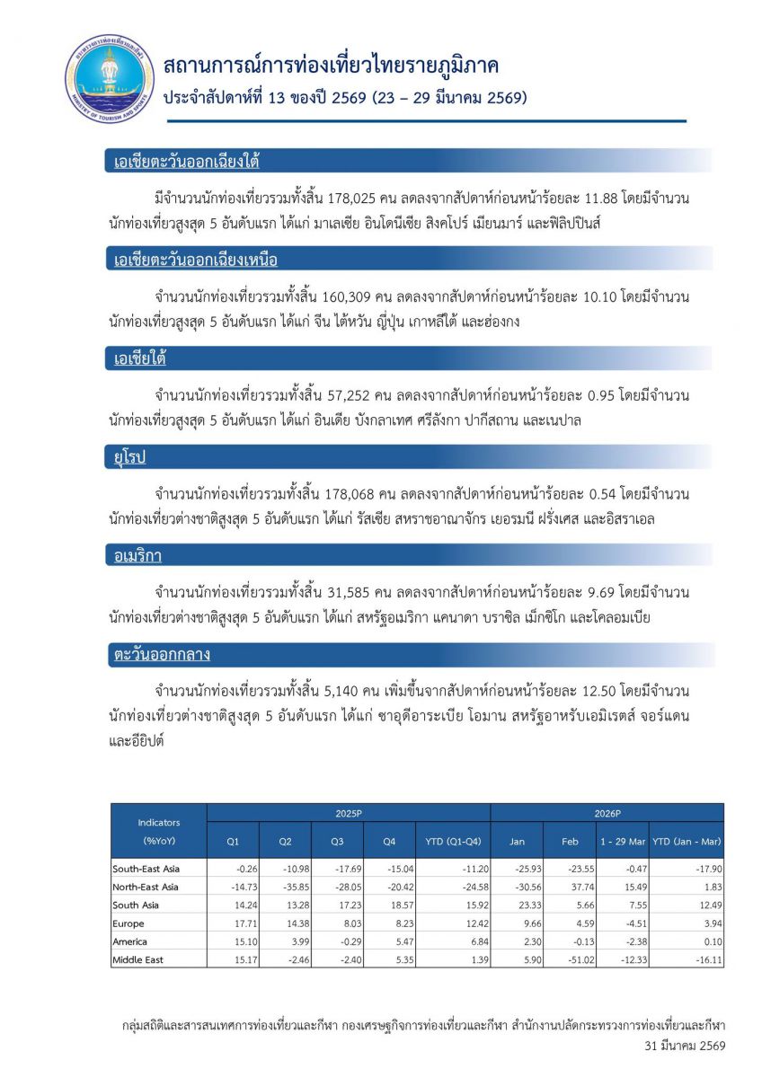 กรุงเทพฯ-กระทรวงการท่องเที่ยวและกีฬา ประเมินสถานการณ์การท่องเที่ยวระหว่างวันที่ 23-29 มีนาคม 2569 ใน 6 โซนทั่วโลก มีจำนวนนักท่องเที่ยวเข้าไทยลดลงถึง 5 โซน กลับกันโซนตะวันออกกลางกับมีนักท่องเที่ยวเพิ่ขึ้นกว่า 12.50% จากซาอุดิฯ โอนมาน ยูเออี จอร์แดนและอียิปต์ ในด้านจำนวนนักท่องเที่ยวสะสม 1 มกราคม-29 มีนาคม 2569 ขยับขึ้นเป็น 9,174,586 คน จีนกลับขึ้นมานำเป็นอันดับ 1 ตามด้วยมาเลเซียน รัฐเซีย อินเดีย และ เกาหลีใต้ตามลำดับ