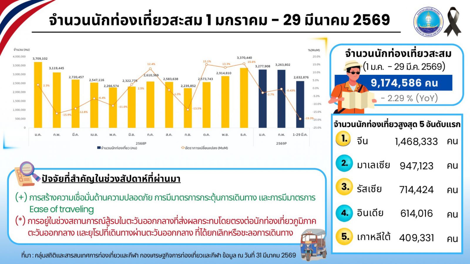 นางสาวนัทรียา ทวีวงศ์ ปลัดกระทรวงการท่องเที่ยวและกีฬา เผยผลการประเมินจำนวนนักท่องเที่ยวพบว่า ตั้งแต่วันที่ 1 ม.ค. – 29 มี.ค. 69 มีนักท่องเที่ยวต่างชาติเดินทางเข้ามาสะสมกว่า 9.1 ล้านคน สำหรับในช่วงสัปดาห์ที่ผ่านมานักท่องเที่ยวชะลอตัวด้านการเดินทางจากสิ้นสุดการเดินทางท่องเที่ยวในช่วงวันอีดอีฎิ้ลฟิตริของนักท่องเที่ยวกลุ่มตลาดระยะใกล้ (Short haul) และการเข้าสู่ช่วงท้ายของฤดูกาลท่องเที่ยวของนักท่องเที่ยวกลุ่มตลาดระยะไกล (Long haul) แต่นักท่องเที่ยวกลุ่มนี้มีแนวโน้มการเดินทางที่ฟื้นตัวดีขึ้นจากการปรับเปลี่ยนเส้นทางการบินโดยตรงจากยุโรปสู่ไทย ส่งผลให้ภาพรวมในสัปดาห์นี้มีจำนวนนักท่องเที่ยวต่างชาติทั้งสิ้น 630,102 คน ลดลงจากสัปดาห์ก่อนหน้า 45,305 คน หรือร้อยละ 6.71 คิดเป็นจำนวนนักท่องเที่ยวต่างชาติที่เดินทางเข้าประเทศไทยเฉลี่ยวันละ 90,014 คน โดย 5 อันดับแรกของนักท่องเที่ยวต่างชาติ ได้แก่ มาเลเซีย (92,685 คน) จีน (90,583 คน) อินเดีย (47,679 คน) รัสเซีย (45,945 คน) และสหราชอาณาจักร (29,683 คน) โดยนักท่องเที่ยวสหราชอาณาจักรมีการปรับตัวเพิ่มขึ้นจากสัปดาห์ก่อนหน้าร้อยละ 21.27ขณะที่นักท่องเที่ยวมาเลเซีย จีน รัสเซีย และอินเดีย มีการปรับตัวลดลงจากสัปดาห์ก่อนหน้าร้อยละ 13.77 ร้อยละ 4.99 ร้อยละ 4.93 และร้อยละ 1.80 ตามลำดับ