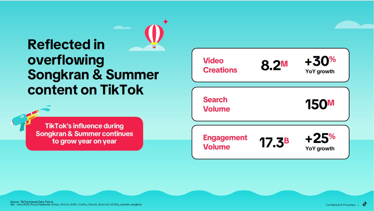 จากอินไซต์ของ TikTok แน่นอนว่า ที่เคยมองว่าสงกรานต์เป็นเพียงช่วงเวลา Peak สั้น ๆ ได้ถูกนิยามใหม่ในปี 2026 สู่การเป็น Sustained Seasonal Economy ที่เติบโตอย่างต่อเนื่องและมั่นคง และได้เปลี่ยน Consumer Journey ของคนไทยให้เป็นวัฏจักรที่ลื่นไหลระหว่างการค้นพบสิ่งใหม่และการเข้าไปมีส่วนร่วมอย่างสร้างสรรค์ ด้วยการเติบโตอย่างแข็งแกร่งของการสร้างคอนเทนต์ การค้นหา และการมีส่วนร่วมบนแพลตฟอร์ม TikTok ได้ทรานส์ฟอร์มเป็น Digital Town Square พื้นที่ที่วัฒนธรรมและความโดดเด่นตลอดซัมเมอร์ของไทยถูกร่วมสร้างขึ้นมา และทำหน้าที่เป็น Pulse of Summer ที่สะท้อนทิศทางความต้องการของผู้บริโภคได้อย่างแม่นยำ