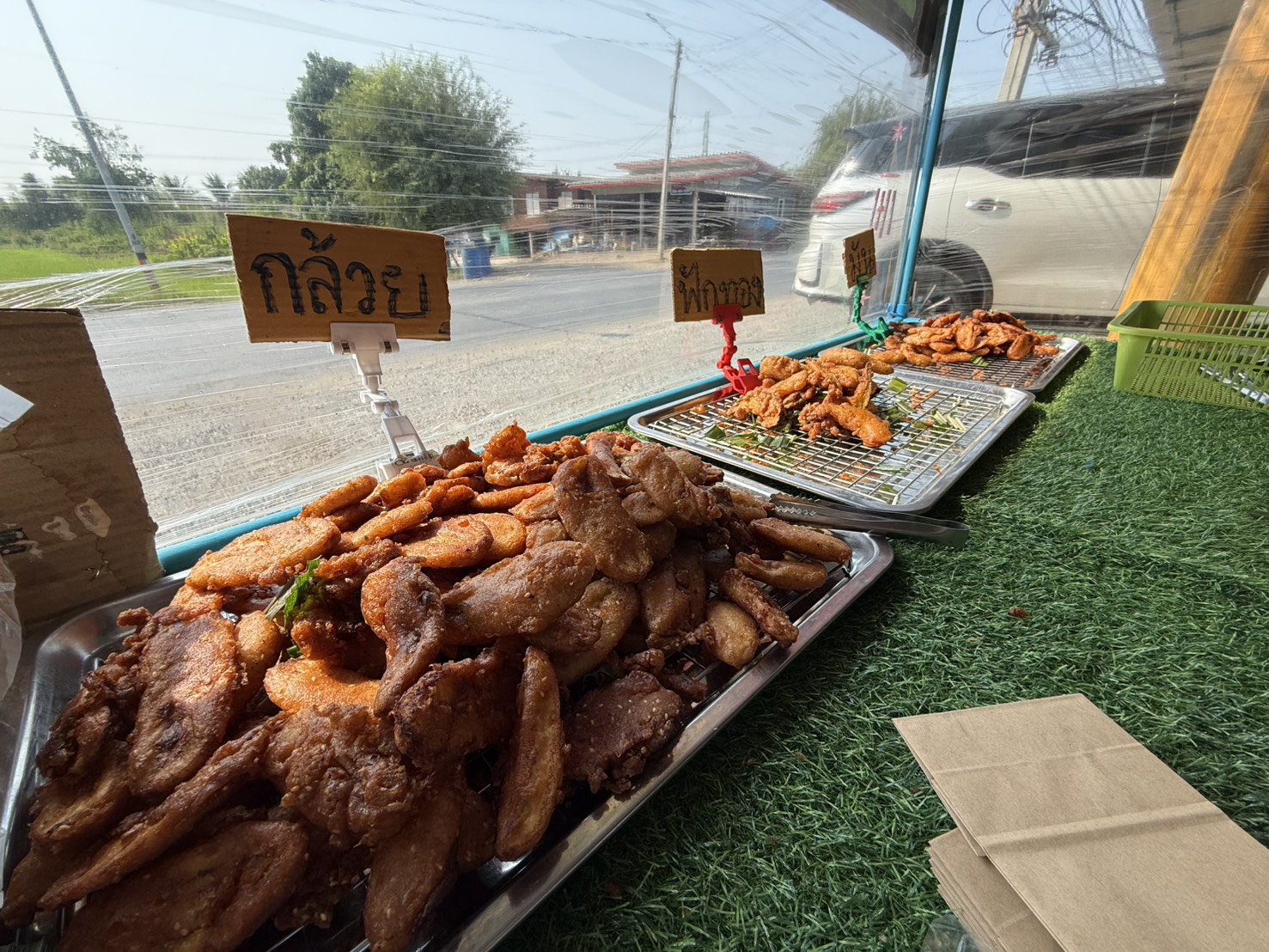 “ วันนี้ ”ชายต้น” พาชิม ได้ขับรถหลงทางผ่านมาหมู่บ้านหนองคางแมว หมู่ 7 ตำบลท่าผา อำเภอบ้านโป่ง จังหวัดราชบุรี ขับผ่านไฟแดงมา ด้วยสัญชาตญานของสื่อมวลชนสายตาอันแหลมคมเหลือบไปเห็นคนมุงอะไรกันเยอะมากจนล้นทะลักออกมาถึงนอกถนน ขับเลยไปรีบเหยียบเบรคดังเอี๊ยดดดดด จนควันออกล้อรถ รีบสับเกียร์ถอยหลังกลับมาอย่างรวดเร็ว ตอนแรกนึกว่าคนทะเลาะกันจะได้ทำข่าวเสียเลย แต่ปรากฏว่าได้มีกลิ่นหอมตลบอบอวลเหมือนของทอดลอยโชยมาตามสายลมจนทะลุกระจกรถกลิ่นความหอมโชยมาแตะปลายจมูก จนทนไม่ไหวรีบเปิดประตูลงจากรถทันที แหวกฝูงชนแทรกตัวเข้าไป โอ้โห แม่เจ้าโว้ยยย “กล้วยทอด มันทอด เผือกทอด ฟักทองทอดนั่นเอง” สีนี้เหลืองอร่ามกระแทกดวงตาแถมบอดแม้น่าลิ้มลองเหลือเกิน จนน้ำลายไหลหยดออกมาจากปาก ไม่รอช้ารีบสั่งมาชิม 100 บาท ทันที หยิบใส่ปากเสียงกัดดังกร๊วบๆๆๆไปด้วยแป้งชั้นดี กล้วยนุ่มนิ่มสะดุ้งลิ้นดีเหลือเกิน ความอร่อยไม่ต้องพูดถึงมันอร่อยยันโคนลิ้น กล้วยทอดไหลลงไปในกระเพาะอาหาร ความอร่อยยังแตะที่โคนลิ้นอยู่เลย กล้วยทอดชิ้นหนามาก แม่ค้าไม่หวงกล้วยเลย เคี้ยวเพลิน อร่อยมาก หอมกลิ่นใบเตย รสชาติหวานนิดๆ ไม่หวานมาก รสชาติของกล้วยแบบธรรมชาติติดลิ้นละมุนทีเดียว แถมมีรสชาติของกลิ่นมะพร้าวด้วย ขอบอกไม่เคยได้ลิ้มลองกล้วยทอด มันทอด เผือกทอด ฟักทองทอด รสชาติแบบนี้มาก่อนเลยถือว่ามีบุญวาสนามากที่ได้ขับรถหลงทางมา