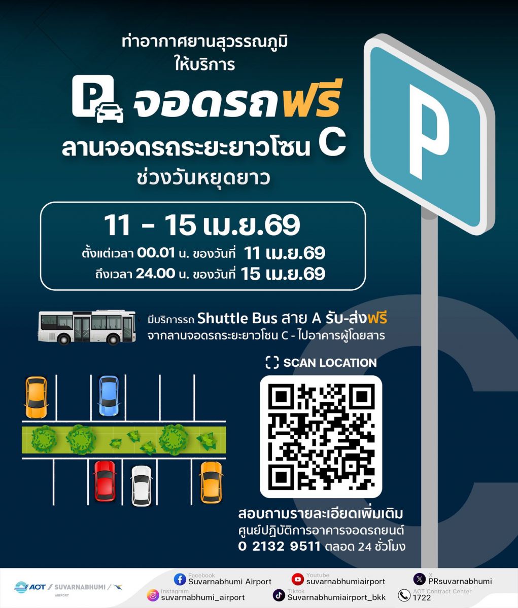 ทั้งนี้ เพื่อช่วยบรรเทาภาระค่าใช้จ่ายของประชาชนในช่วงวันหยุดยาว ทสภ. ให้บริการจอดรถฟรี 5 วัน ตั้งแต่เวลา 00.01 ของวันเสาร์ที่ 11 เมษายน 2569 ถึงเวลา 24.00 น. ของวันพุธที่ 15 เมษายน 2569 ณ ลานจอดรถระยะยาวโซน C พร้อมจัดรถรับ - ส่ง ระหว่างลานจอดรถและอาคารผู้โดยสารทุก 15 นาที ตลอด 24 ชั่วโมง