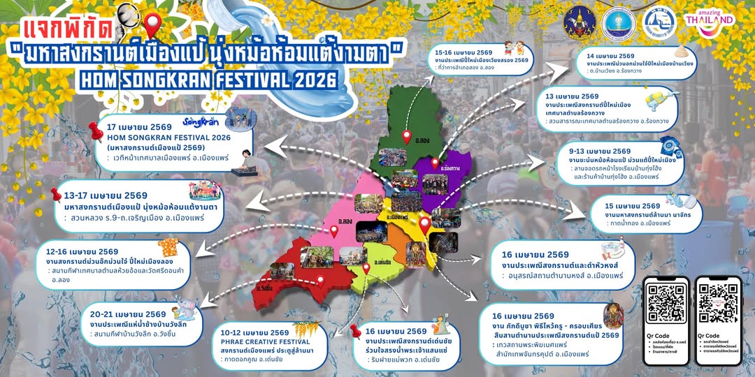 ททท.แพร่ แจกพิกัดที่เที่ยวมหาสงกรานต์เมืองแป้ นุ่งหม้อห้อมแต้งามตา ” (HOM SONGKRAN FESTIVAL 2026พร้อมชวนทุกคนใส่ชุดหม้อห้อมเล่นน้ำ ร่วมสืบสานประเพณีล้านนา ชมขบวนแห่สุดอลังการ สนุกกับมหาสงกรานต์เมืองแป้ และชมคอนเสิร์ตสุดมันส์ไปด้วยกัน