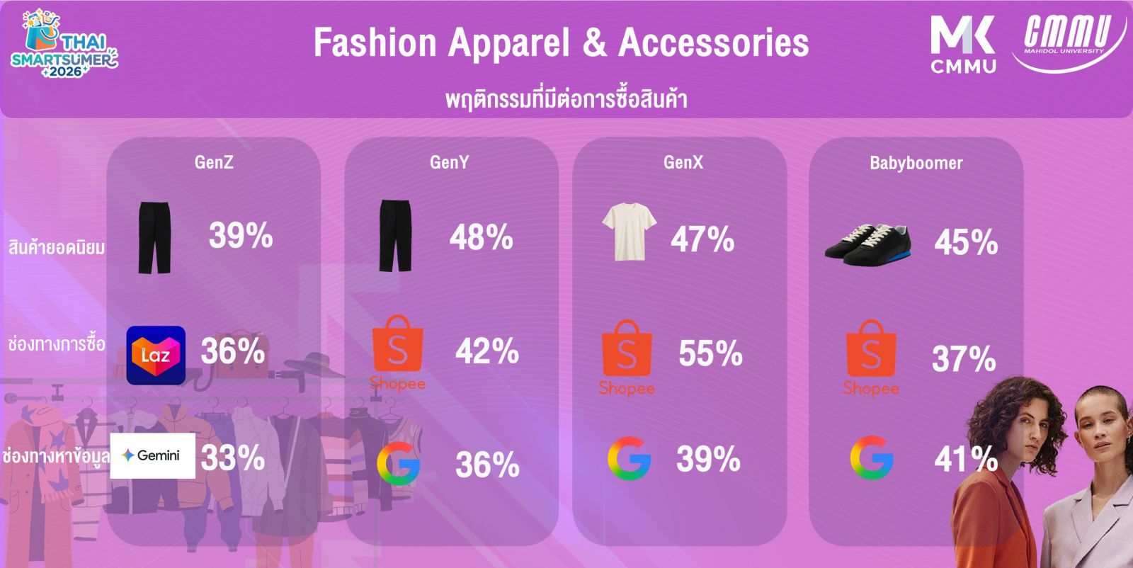 จาการวิจัยโดยใช้ Mixed Method กับผู้บริโภคใน 4 เจเนอเรชัน ทั้งสัมภาษณ์เชิงลึก และแบบสอบถาม ครอบคลุม 5 หมวดสินค้า ได้แก่ Technology & Gadgets, Beauty & Personal Care, Fashion Apparel & Accessories, Home & Appliances และ FMCG & Daily Essentials พบว่า ผู้บริโภคไทย 90 - 97% ทุกช่วงวัยมีความพิถีพิถันในการซื้อสินค้า สะท้อนเป็นพฤติกรรม 5 มิติ คือ Search & Compare, Maximize Value, Authentic Demand , Risk Reduction และ Timing & Patience โดย Gen X ให้ความสำคัญสูงสุด ส่วน Gen Z แม้ให้ความสำคัญน้อยสุดแต่กลับเด่นเรื่องจังหวะราคาและโปรโมชัน (62%) และกว่า 71% ใช้ AI ช่วยหาข้อมูลสินค้า ช่วยสรุปรีวิว ตรวจสอบร้านค้า เปรียบเทียบราคา และคาดการณ์ราคานำโดย Gen Z (99%) และ Gen Y (96%) นอกจากนั้น ผู้บริโภคเริ่มถูกกระตุ้นเมื่อราคาลด 11 - 20% และทนราคาขึ้นได้ถึง +21 - 30% ยกเว้น FMCG ที่ทนได้แค่ +11 - 20% เมื่อราคาเกินจุดรับได้ พฤติกรรมหลัก คือ รอโปรโมชัน หาข้อมูลเพิ่ม และเปลี่ยนแบรนด์ทันที ซึ่งจากการเปรียบเทียบพฤติกรรมการซื้อสินค้าใน 5 หมวดสินค้า พบว่า