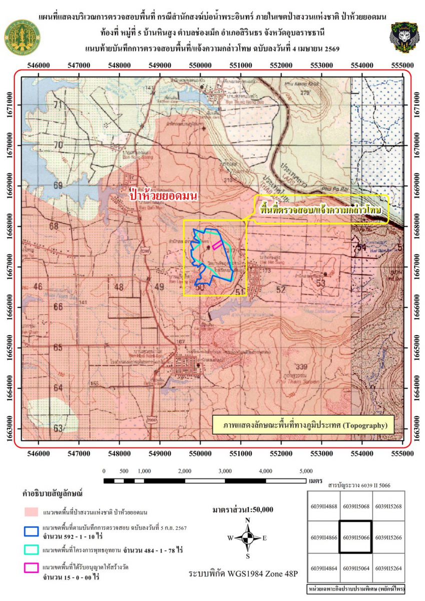 วันที่ 15 เมษายน 69 จากกรณีชุดเฉพาะกิจปราบปรามพิเศษ (พยัคฆ์ไพร) กรมป่าไม้ ได้ลงพื้นที่ในการตรวจสอบ ที่พักสงฆ์วัดป่าบ่อน้ำพระอินทร์ หรือที่พักสงฆ์บ่อน้ำพระอินทร์ ซึ่งอยู่ภายในเขตป่าสงวนแห่งชาติ ป่าห้วยยอดมน บ้านหินสูง หมู่ที่ 5 ตำบลช่องเม็ก อำเภอสิรินธร จังหวัดอุบลราชธานี เมื่อวันที่ 3 เมษายน 69 ที่ผ่านมา โดย พบมีการก่อสร้างสิ่งปลูกสร้างลักษณะที่พักสงฆ์ แม่ชี หรือผู้มาปฎิบัติธรรม แซม หรือแทรก ระหว่างหรือไม้ยืนต้นโดยไม่ได้รับอนุญาตจากเจ้าพนักงานจำนวน 48 รายการ ซึ่งสามารถคำนวณเนื้อที่ครอบครองดังกล่าวเนื้อที่ทั้งสิ้น 12 ไร่ 36 ตารางวา อันเป็นความผิดอันเป็นความผิดตาม พรบ.ป่าสงวนแห่งชาติ พ.ศ 2507, พรบ.ป่าไม้ พ.ศ 2484 ต่อมาได้มีการเข้าแจ้งความเพื่อดำเนินคดีในความผิดฐานยึดถือครอบครองทำประโยชน์หรืออยู่อาศัยในที่ดินอันเป็นการเสื่อมเสียแก่สภาพป่าสงวนแห่งชาติ แผ้วถางหรือกระทำด้วยประการใดๆอันเป็นการทำลายป่าหรือเข้ายึดถือเข้าครอบครองป่าเพื่อตนเองหรือผู้อื่นไม่เกิน 25 ไร่ โดยไม่ได้รับอนุญาตจากพนักงานเจ้าหน้าที่ สถานีตำรวจภูธรช่องเม็ก จังหวัดอุบลราชธานีเมื่อวันที่ 4 เมษายน 69