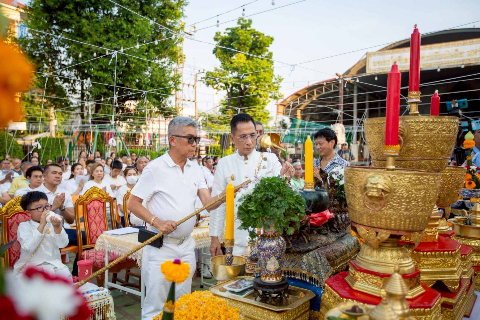 โดยในพิธีได้อัญเชิญพระพุทธประทานอภัย เป็นองค์ประธาน ประกอบด้วย 9 องค์เทพยาดา ตั้งเรียงรายอยู่ด้านล่าง และมีรูปหล่อเสมือนจริงของพระเดชพระคุณหลวงพ่อพูล อัตตรักโข อดีตเจ้าอาวาสวัดไผ่ล้อมรูปแรก นั่งเป็นองค์สักขีพยาน ซึ่งมีมหาสังข์เรียกทรัพย์ ตั้งไว้บนโต๊ะบวงสรวงในพิธี เพื่อความเป็นสิริมงคล ท่ามกลางผู้เข้าร่วมพิธีเต็มพื้นที่บริเวณหน้าพระอุโบสถ