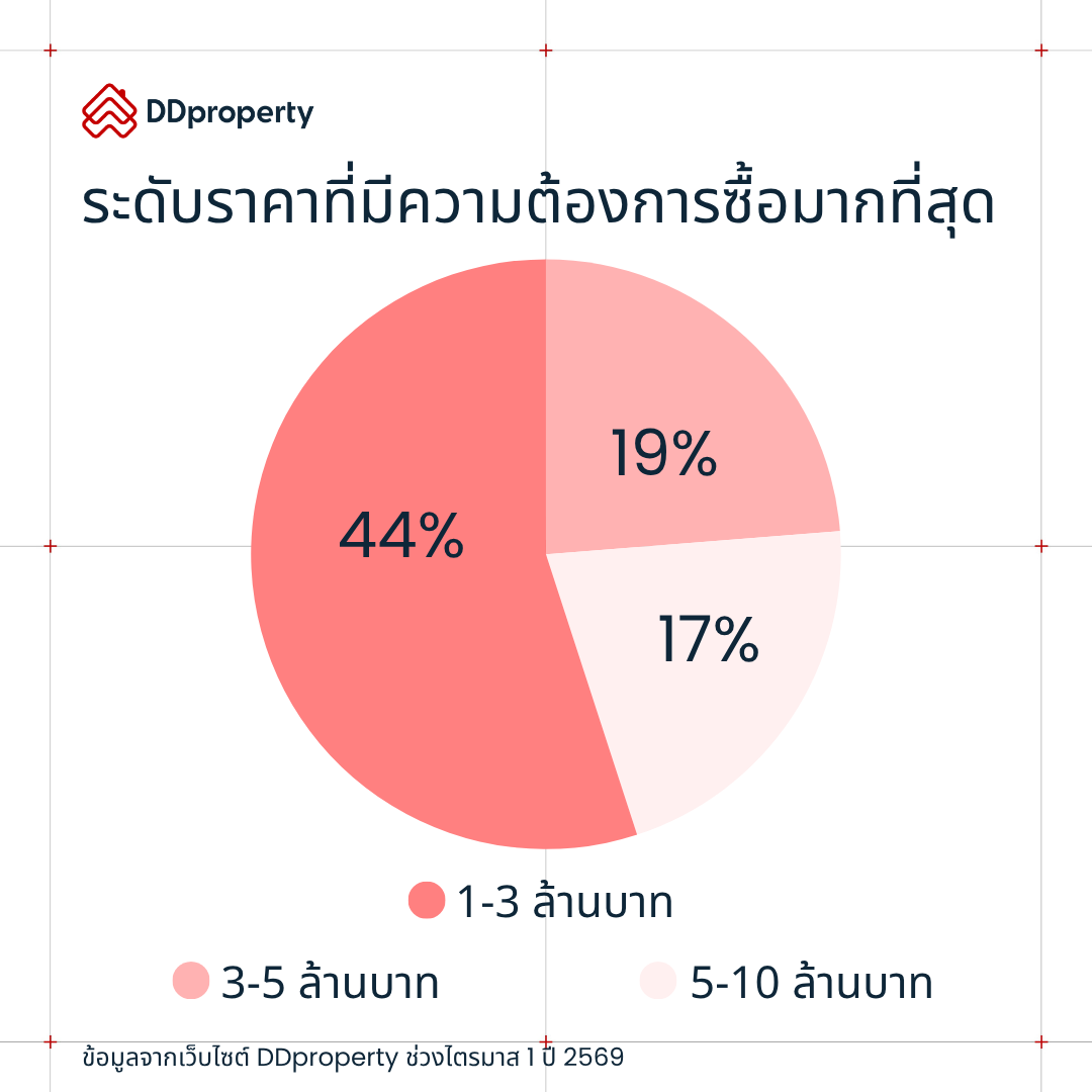 ข้อมูลเชิงลึกจากผู้เข้าเยี่ยมชมเว็บไซต์ www.DDproperty.com ระหว่างเดือนมกราคม-มีนาคม 2569 เผยภาพรวมความต้องการซื้อที่อาศัยทั่วประเทศยังคงมีทิศทางชะลอตัว โดยลดลง 6% จากไตรมาสก่อน (QoQ) มีเพียงคอนโดฯ เท่านั้นที่ความต้องการซื้อเติบโต 4% QoQ สวนทางกับที่อยู่อาศัยแนวราบอย่างบ้านเดี่ยวและทาวน์เฮ้าส์ที่ความต้องการซื้อลดลง 17% QoQ และ 16% QoQ ตามลำดับ สะท้อนให้เห็นแนวโน้มการเติบโตของที่อยู่อาศัยแนวดิ่งที่กลับมาได้รับความนิยมอีกครั้ง ด้วยจุดเด่นที่มีราคาไม่สูงมาก เหมาะกับผู้ที่ต้องการมีที่อยู่อาศัยเป็นของตัวเองหรือเริ่มต้นสร้างครอบครัวภายใต้งบประมาณที่ควบคุมได้