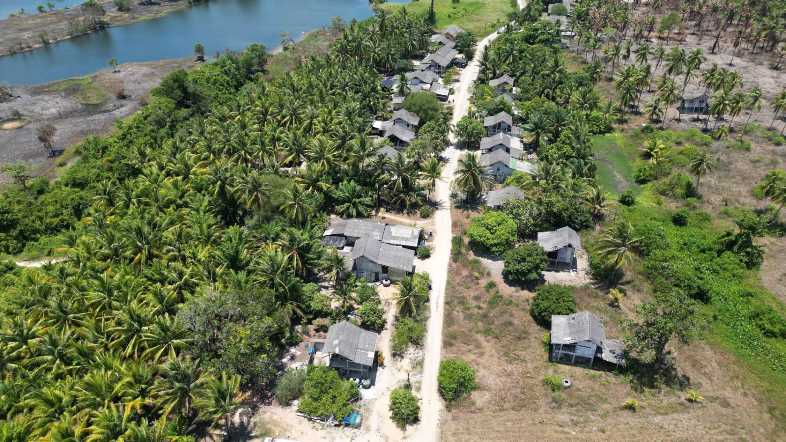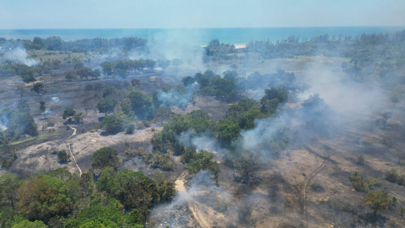 พังงา-ภาพมุมสูง เจ้าหน้าที่ดับเพลิงเข้าฉีดน้ำสกัดเพลิงที่กำลังลุกไหม้ที่ดินรกร้างของเอกชนนับ 100 ไร่ไม่ให้ลุกลามถึงบ้านเรือนประชาชนและโรงแรมบริเวณใกล้เคียง