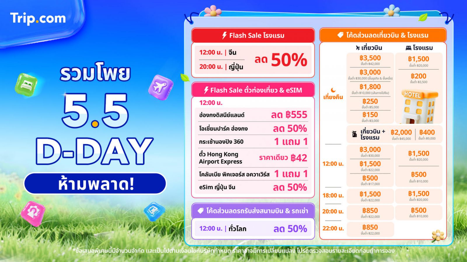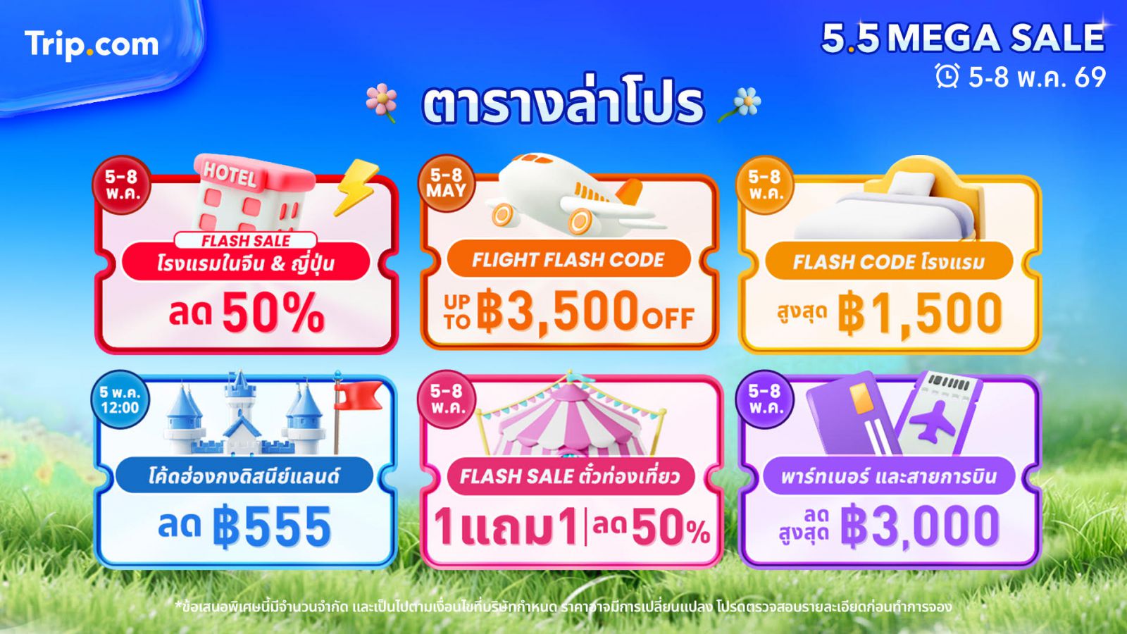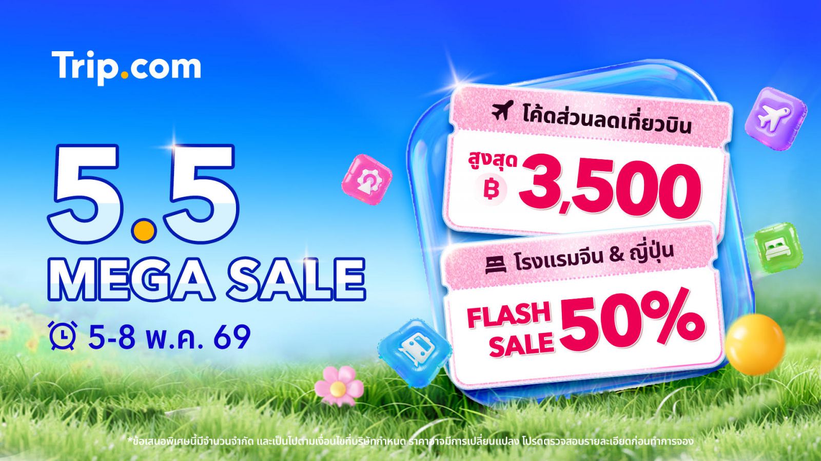 กรุงเทพฯ, 30 เมษายน 2569 – Trip.com แพลตฟอร์มให้บริการด้านการท่องเที่ยวออนไลน์ จัดโปรโมชัน “5.5 Mega Sale” ระหว่างวันที่ 5 - 8 พฤษภาคม 2569 พร้อมดีลท่องเที่ยวสุดคุ้มที่ออกแบบมาเพื่อมอบความคุ้มค่าสูงสุดให้กับนักเดินทาง โปรโมชันครั้งนี้มาพร้อมไฮไลต์ อาทิ ดีล Flash Sale โรงแรมลดสูงสุด 50%* โค้ดส่วนลดตั๋วเครื่องบินสุดพิเศษ ตั๋วเข้าสถานที่ท่องเที่ยวแบบซื้อ 1 แถม 1* และส่วนลดสูงสุด 50%* บริการเช่ารถและรถรับส่งสนามบิน รวมถึงแพ็กเกจ Bundle & Save สำหรับการจองแบบครบวงจร โดยโปรโมชัน 5.5 Mega Sale มีดีลท่องเที่ยวหลากหลายให้จองตลอดทั้งวัน เพื่อตอบโจทย์ทุกความต้องการในการเดินทาง